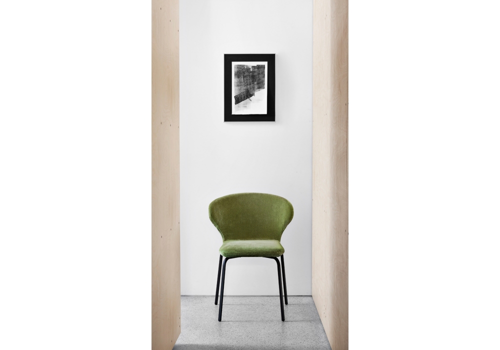 Mula Basic diseñada por E-ggs para Miniforms es una silla con patas de metal, carcasa en poliuretano flexible estampado en frío con revestimiento en tejido. Disponible en diferentes acabados.