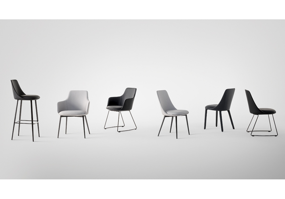 Itala diseñada por Gino Carollo para Bonaldo es una silla disponible en varios modelos, con patín o con 4 patas en metal pintado en diferentes acabados. La funda no desenfundable es de tela o piel en varios colores.