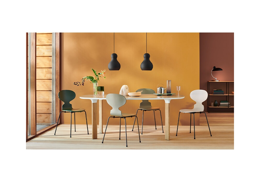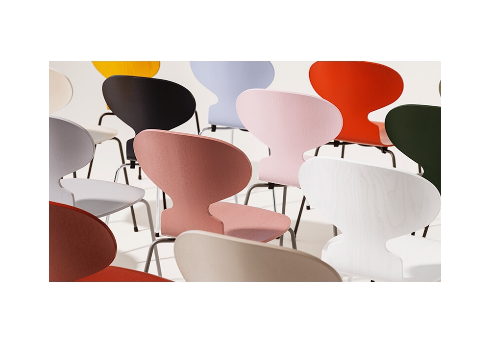 Ant™ diseñada por Arne Jacobsen para Fritz Hansen es una silla con 3 o 4 patas realizada con carcasa en chapa de fresno natural, coloreado o lacado y patas en tubo de acero cromado o pintado con polvos. Disponible en diferentes acabados.