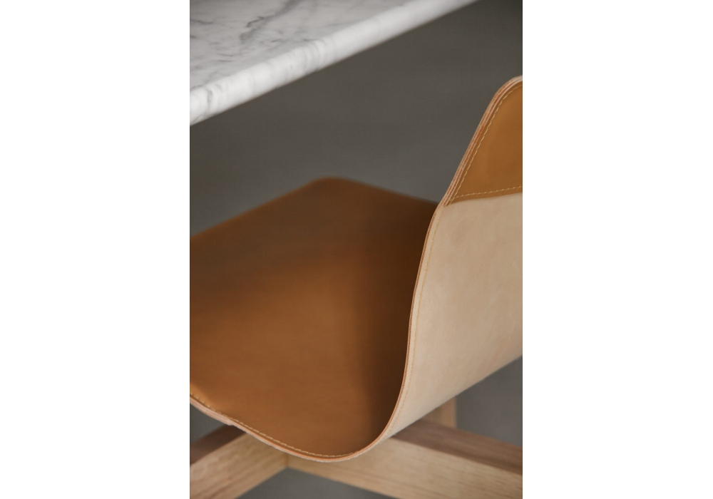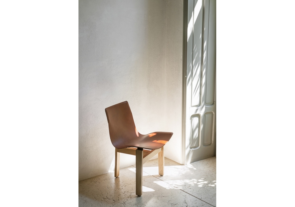 Tre 3 diseñada por Angelo Mangiarotti para AgapeCasa es una silla realizada con estructura de madera maciza de roble en diferentes acabados. Tapicería en piel natural, “cruda” o negra.