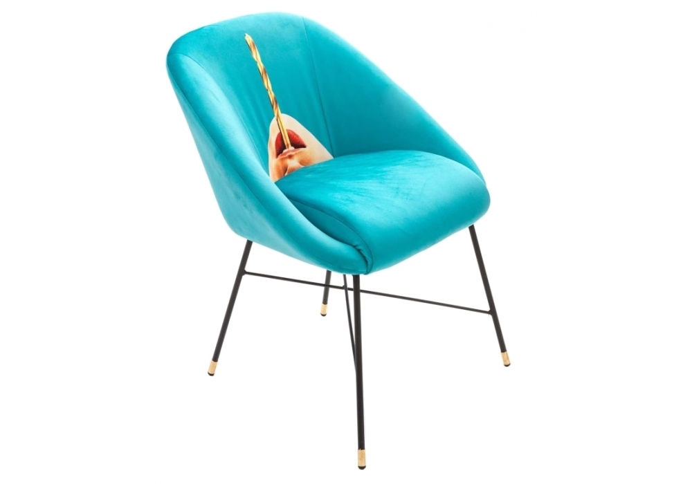 Drill New diseñada por Toiletpaper para Seletti es una silla con pies de metal tubular negro con detalles en latón. El cuerpo está fabricado en madera contrachapada con acolchado de poliuretano y revestimiento de poliéster.