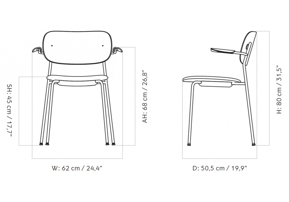 Co Veneer diseñada por Norm Architects & Els Van Hoorebeeck para Audo Copenhagen es una silla con patas en acero pintado en polvo negro o cromado, asiento y respaldo en roble chapado. Disponible en diferentes acabados y en la versión con o sin reposabrazos.