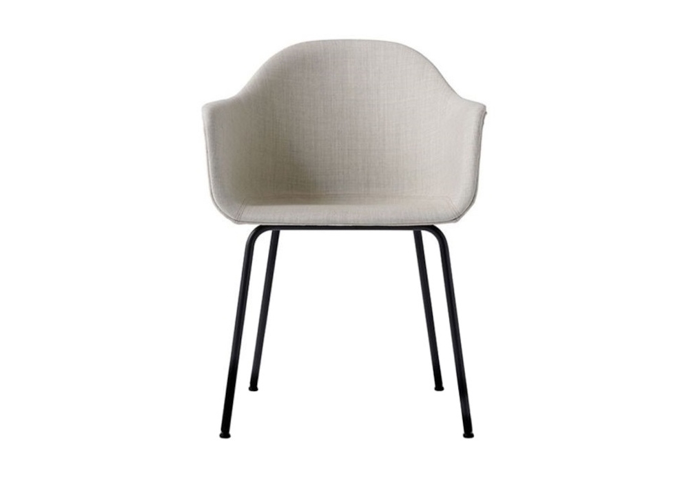 Harbour Steel diseñada por Norm Architects para Audo Copenhagen es una silla con carcasa tapizada en tejido o piel, patas en acero pintado en polvo negro.