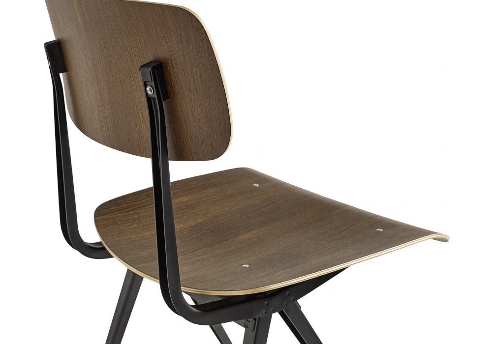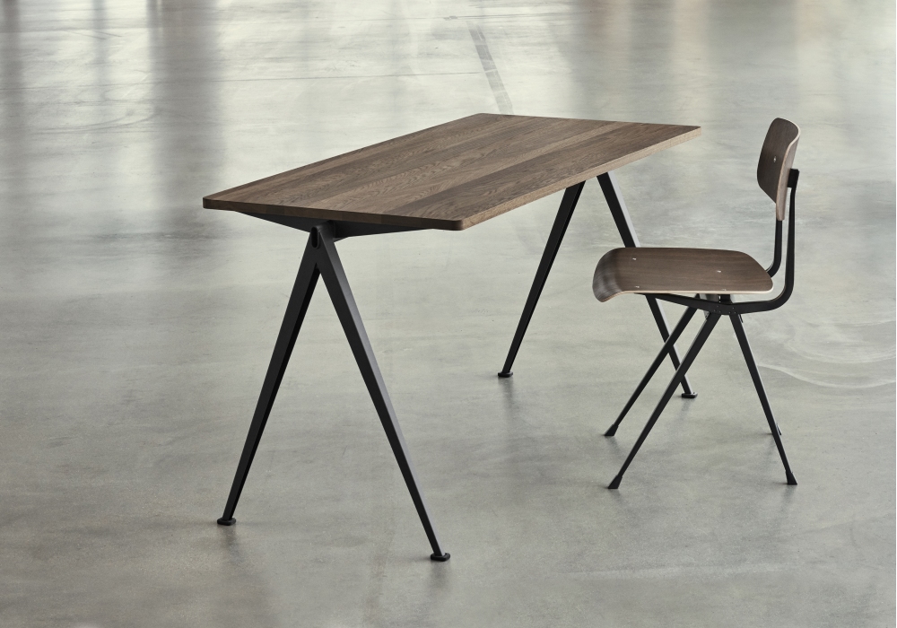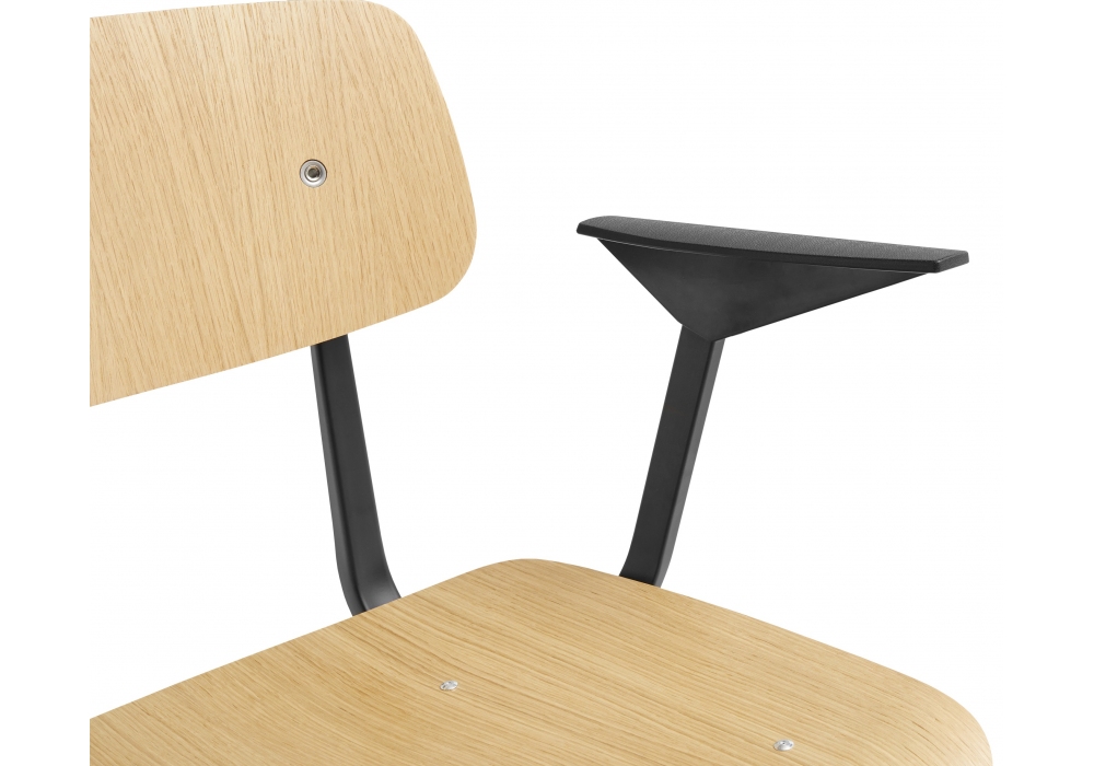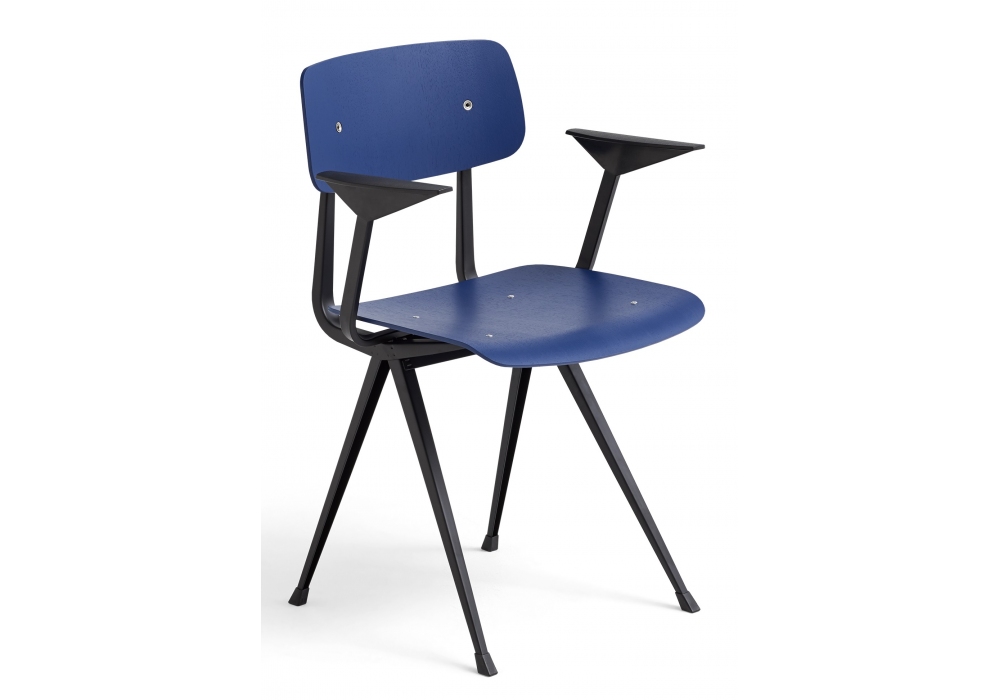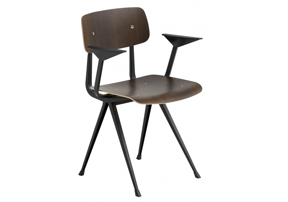 Result diseñada por Friso Kramer & Wim Rietveld para Hay es una silla con asiento y respaldo en contrachapado de roble y base en chapa de acero curvada pintada con polvo negro. Disponible en diferentes acabados.