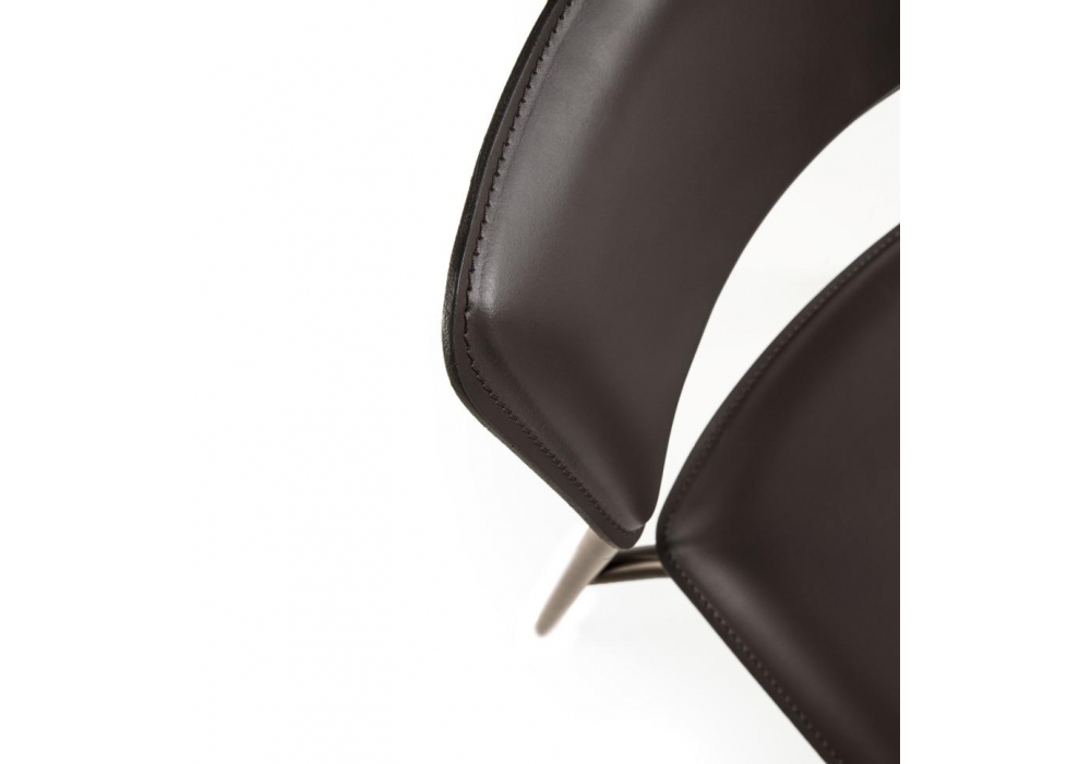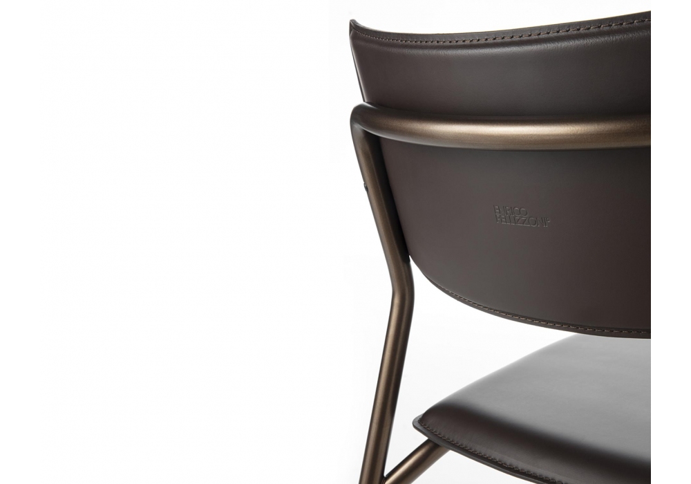 Isotta diseñada por Studio Nove.3 para Enrico Pellizzoni es una silla con estructura tubular de metal, asiento y respaldo en madera curvada revestido en cuero. Disponible en diferentes acabados.