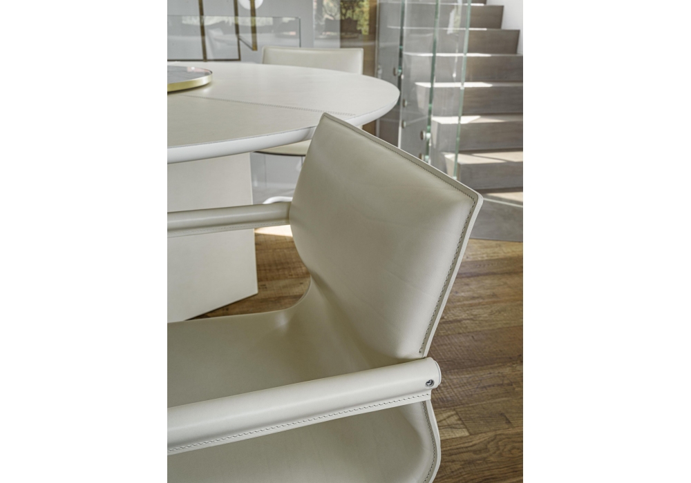 Lybra diseñada por RedCreative para Enrico Pellizzoni es una silla con estructura en tubo de acero, asiento, respaldo y brazos tapizados en piel o piel. Disponible en diferentes acabados.