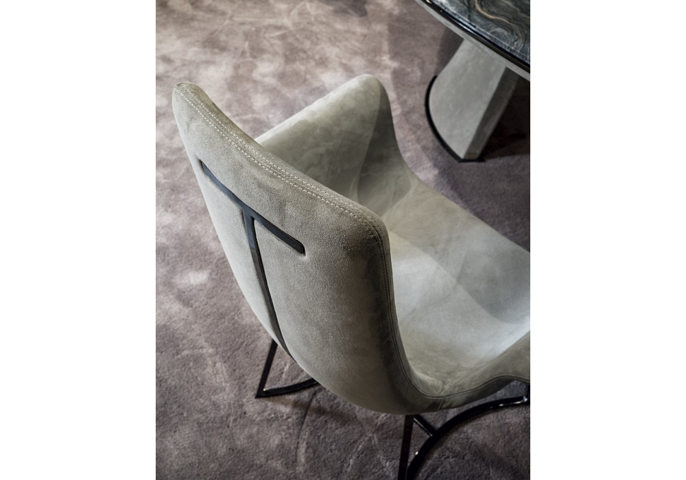 Coral diseñada por Giuseppe Viganò para Longhi es una silla con estructura interna en hierro espumado moldeado en frío. Estructura exterior de metal con acabado galvánico y revestimiento de piel no desenfundable.