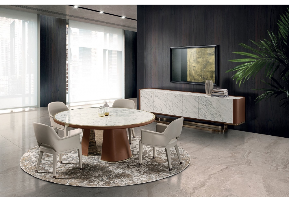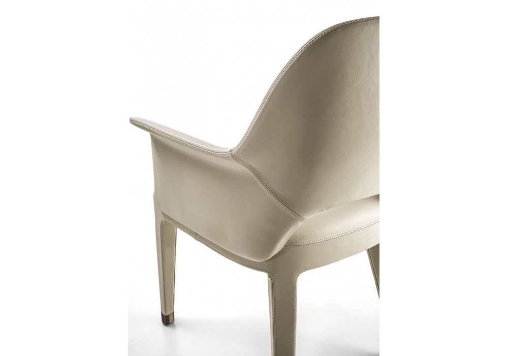 Harmony diseñada por Ben Wu para Longhi es una silla con estructura de respaldo en hierro y poliuretano moldeado en frío. Base del asiento en madera con cinchas elásticas recubiertas de espuma de poliuretano multidensidad. Revestimiento en piel o terciopelo no desenfundable. Para preservar la piel que cubre el talón de la pierna, se insertan 4 puntas de protección PLA de color bronce (opcional). Bajo pedido disponible en la versión bicolor.