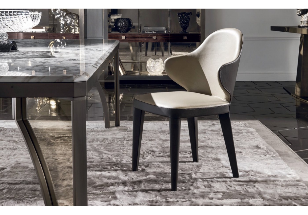 Miss diseñada por Giuseppe Viganò para Longhi es una silla con estructura de madera con correas elásticas y respaldo de madera contrachapada curvada. Relleno de espuma de poliuretano multidensidad. Revestimiento en piel o terciopelo no desenfundable.