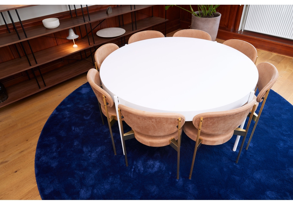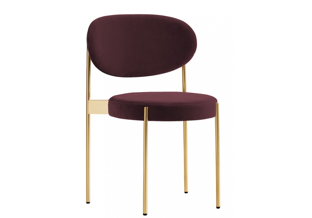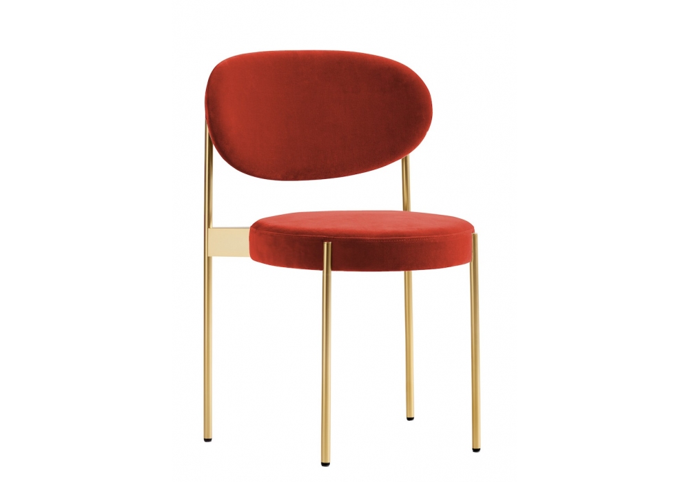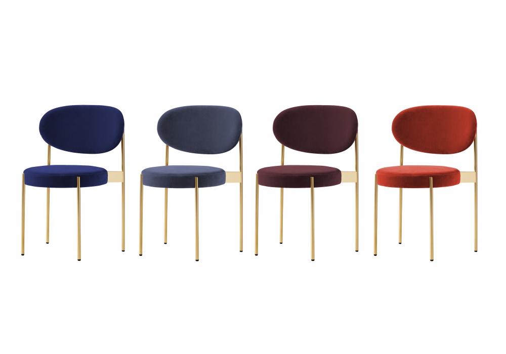 Series 430 diseñada por Verner Panton para Verpan es una silla apilable totalmente tapizada y tapizada en diferentes tejidos o pieles. Estructura metálica en acabado latón con pies de fieltro.