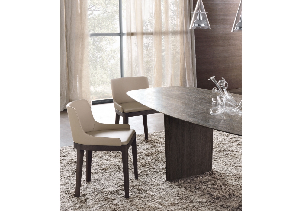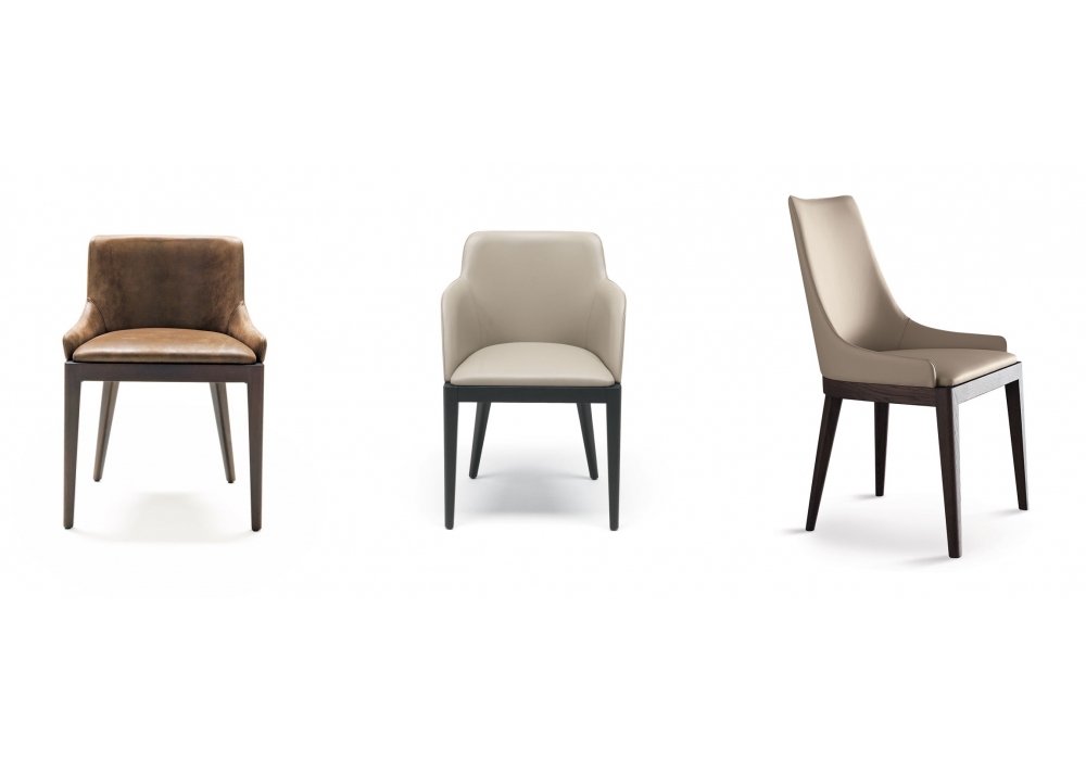 Cleò diseñada por MisuraEmme es una silla realizada con una base artesanal en roble macizo teñido y un asiento y respaldo curvos tapizados en tela o piel. Disponible en diferentes modelos.