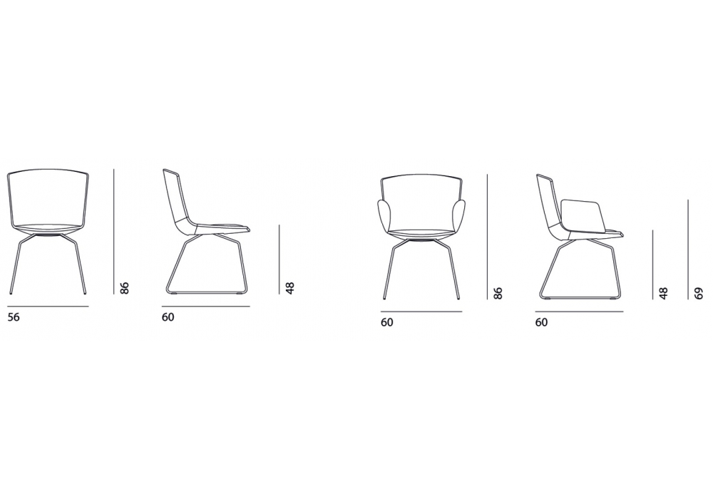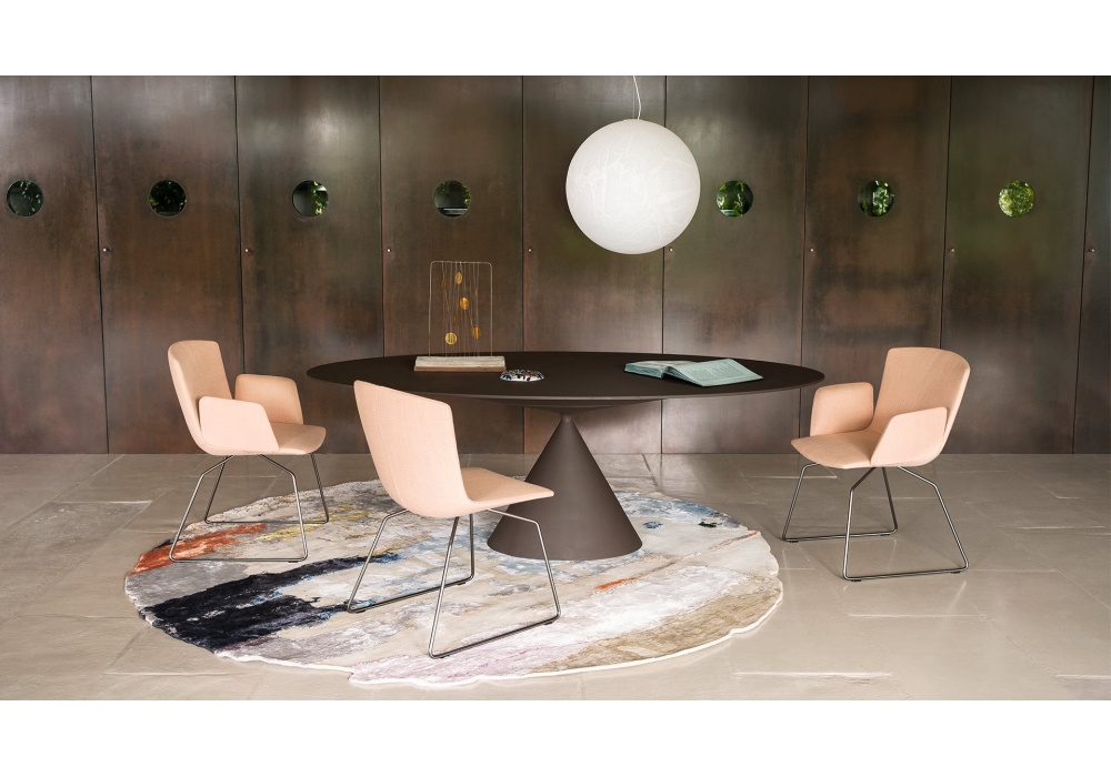 Calum Home Slitta diseñada por Simon Pengelly para Desalto es una silla con estructura en varilla de acero, carcasa de poliuretano rígido y acolchado en espuma, tapizado en tejido o piel. Disponible en diferentes acabados y versiones.