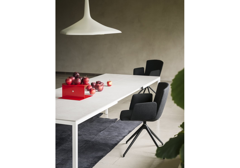 Calum Home diseñada por Simon Pengelly para Desalto es una silla giratoria con base en aluminio fundido a presión, carcasa de poliuretano rígido y acolchado de espuma. Tapicería en tela o cuero. Disponible en diferentes acabados y versiones.