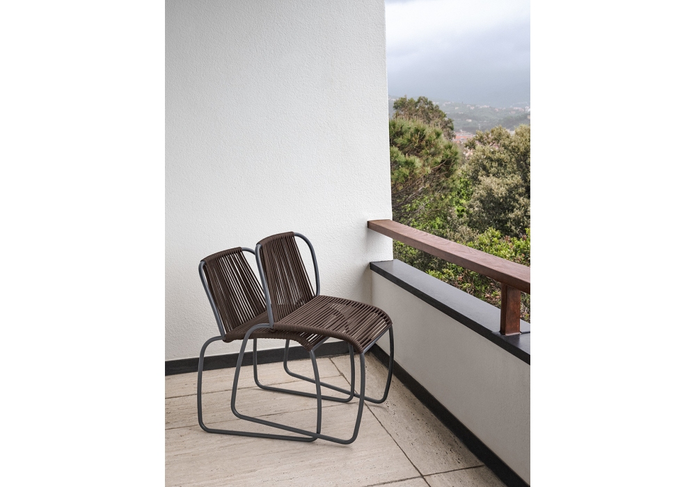 Tibes diseñada por Gregorio Facco para Potocco es una silla de exterior con estructura de acero pintado con polvo epoxi sobre la que se desarrolla el asiento, tejido totalmente a mano. Se pueden apilar hasta 4 sillas.
