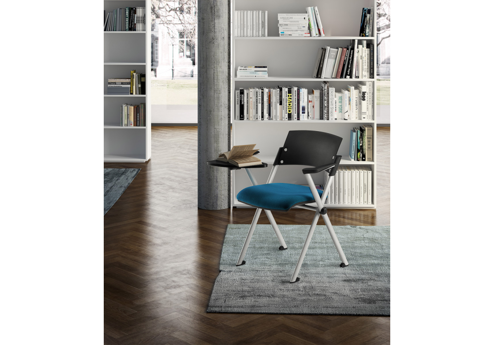 Klic diseñada por R&D Sitlosophy para Sitlosophy es una silla plegable con estructura de 4 patas en tubular elíptico pintado con polvos epoxi con asiento de empuje reclinable. El respaldo es de polipropileno negro y el asiento está tapizado en diferentes tejidos o ecopiel.