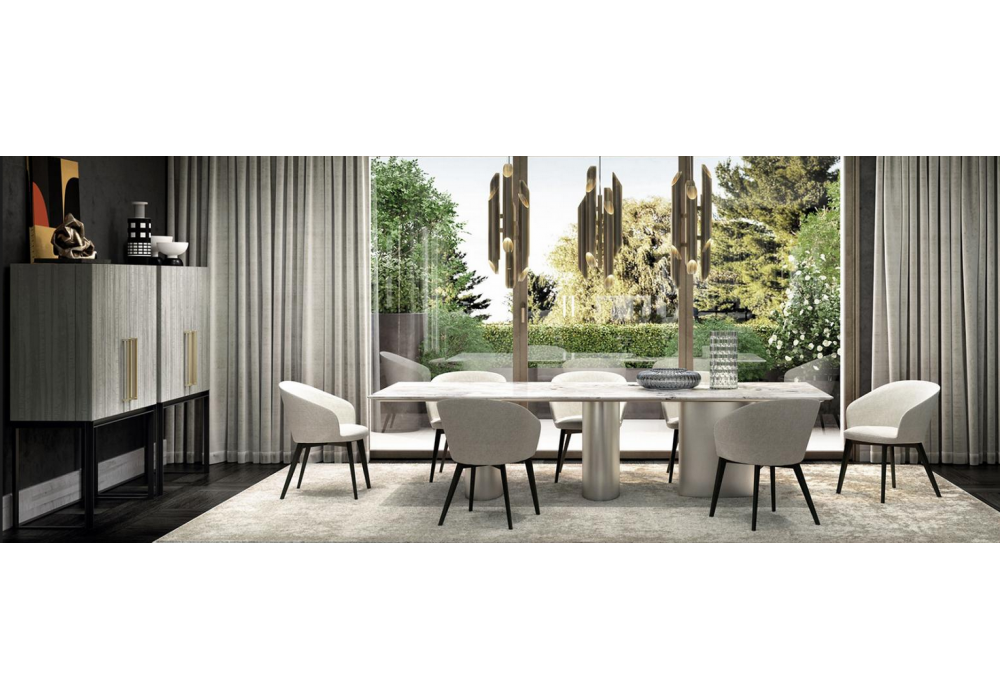 Shirley diseñada por Castello Lagravinese para Casamilano es una silla con estructura en poliuretano flexible. Autoextinguible. Clase 1IM. Inserto de perfil de acero. Base en fresno macizo teñido. Forro fijo.