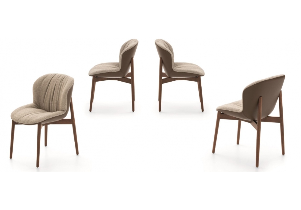 Bounty diseñada por Archirivolto para Ditre Italia es una silla con patas de madera, asiento y respaldo tapizados en tejido. También disponible en la versión mixta, cojines en tejido con laterales y respaldo en piel.