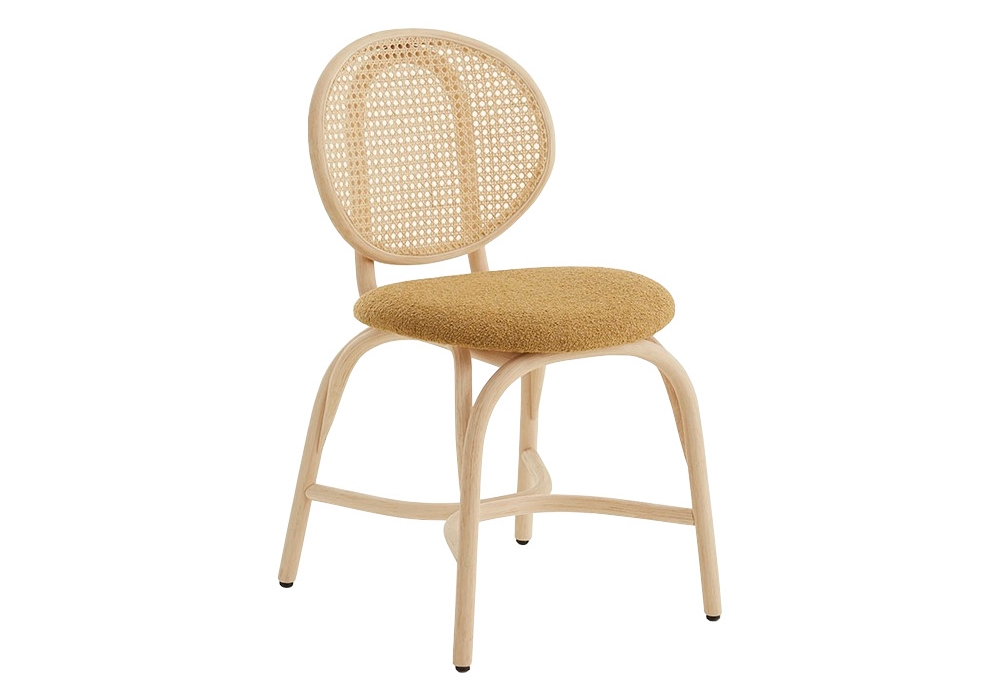 Loop diseñada por Norm Architects para Expormim es una silla con estructura de ratán y asiento acolchado y revestido de tela. Disponible en diferentes acabados.