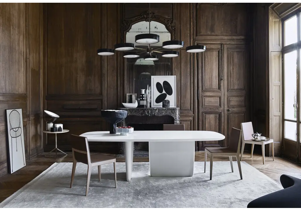 El diseñada por Antonio Citterio para B&B Italia es una silla con patas de roble y tapizado en diferentes tejidos o pieles.