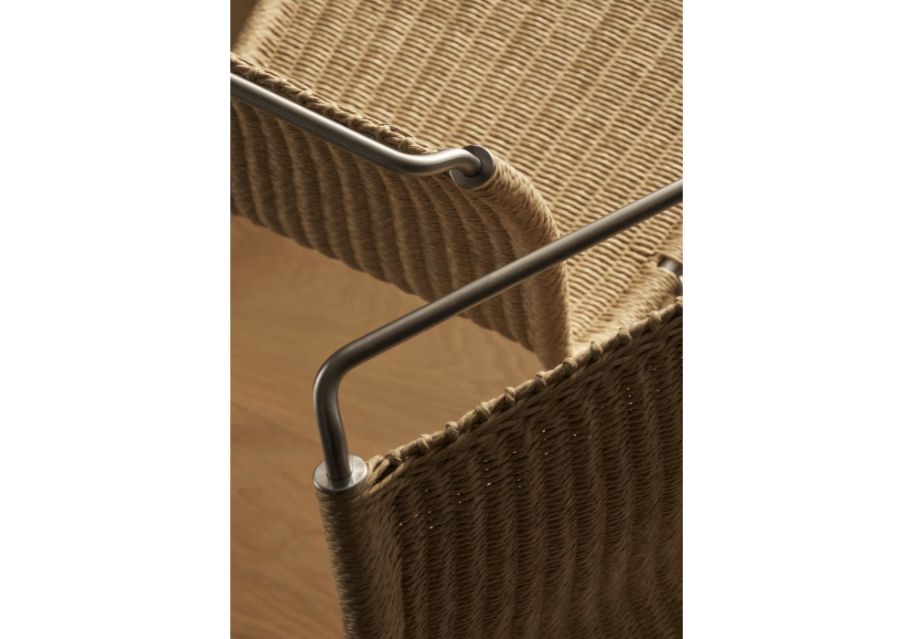 PK1 diseñada por Poul Kjærholm para Carl Hansen & Søn es una silla con estructura de acero inoxidable o con revestimiento en polvo negro. Asiento de cuerda de papel natural.