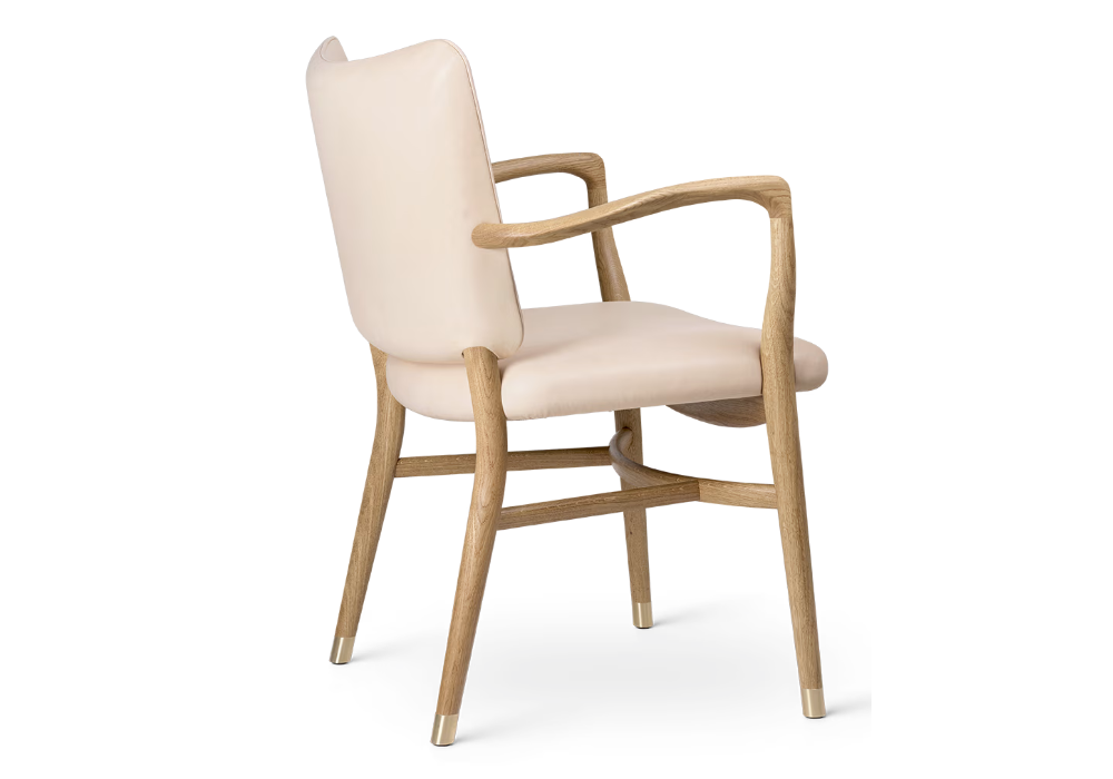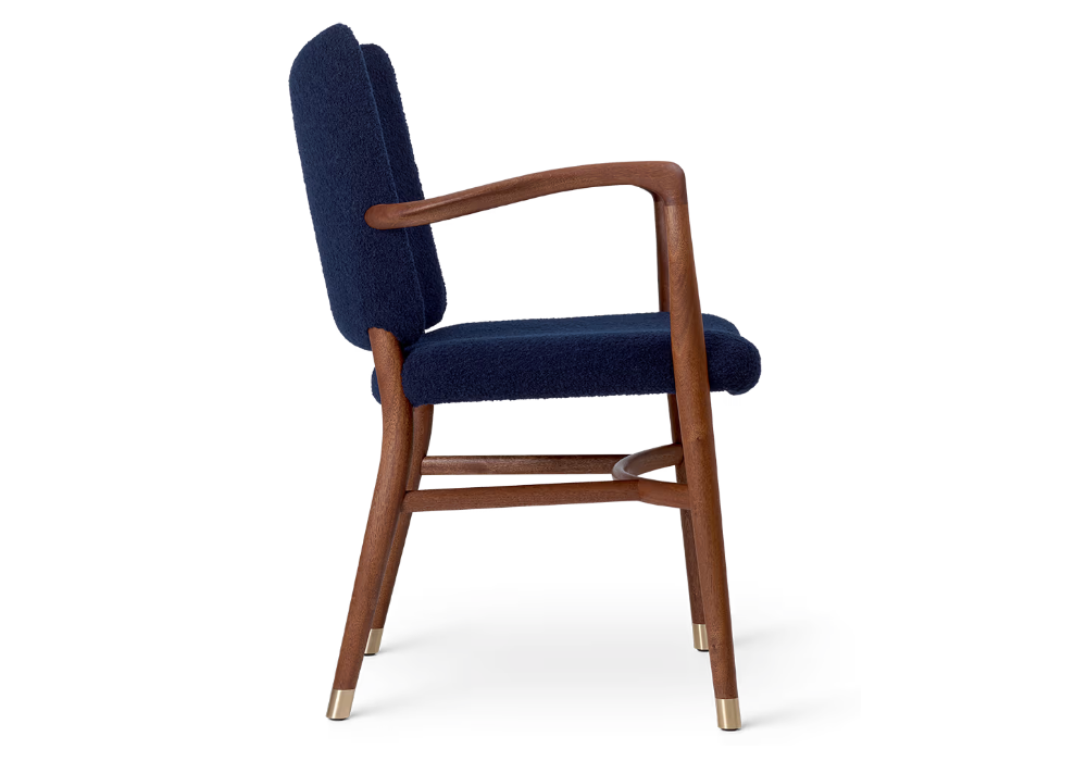 VLA61 Monarch Chair diseñada por Vilhelm Lauritzen para Carl Hansen & Søn es una silla con estructura de roble macizo o caoba en varios acabados y patas de latón. Asiento y respaldo de espuma con tapizado de tela o piel.