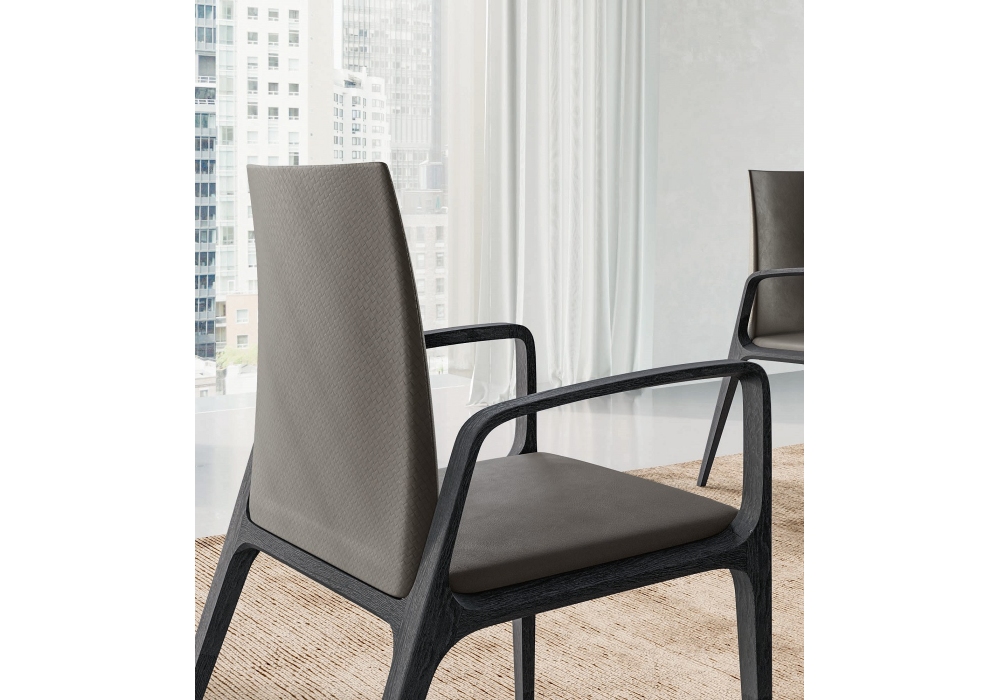 Wendy diseñada por Dall'Agnese es una silla acolchada con o sin brazos realizada con estructura de madera y tapizada en tejido, piel o ecopiel. Disponible también con el tapizado del respaldo en acabado diferente al del frente.