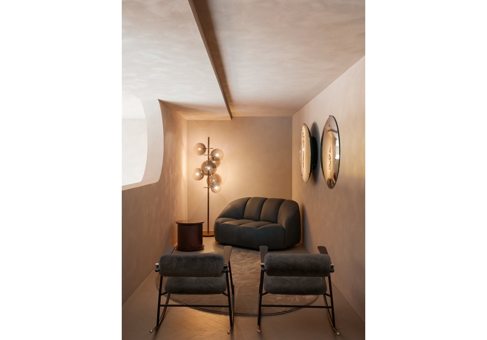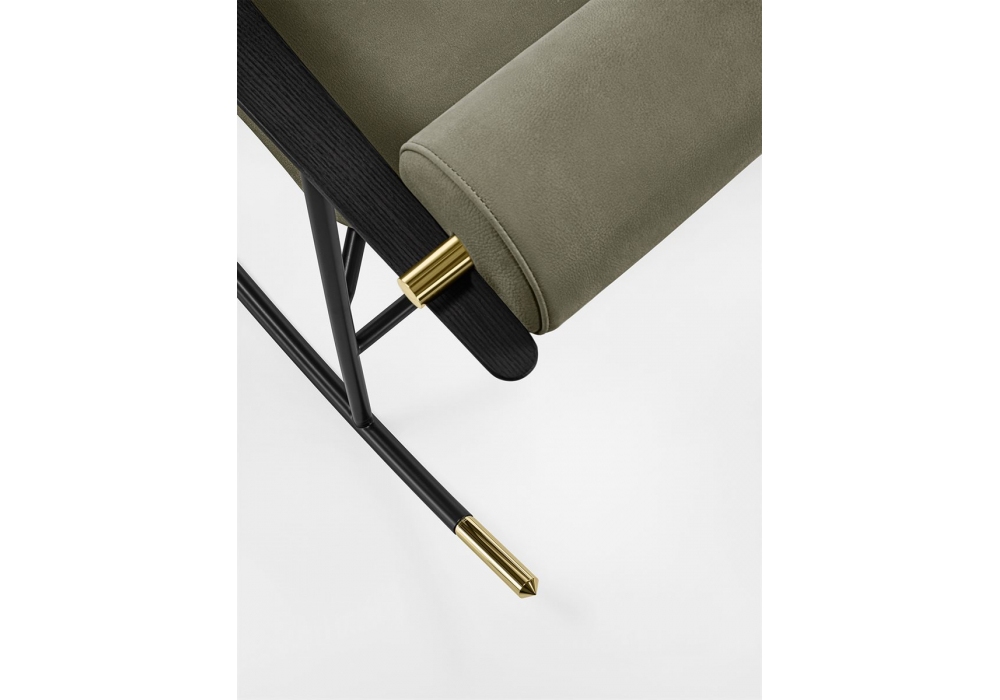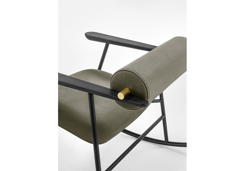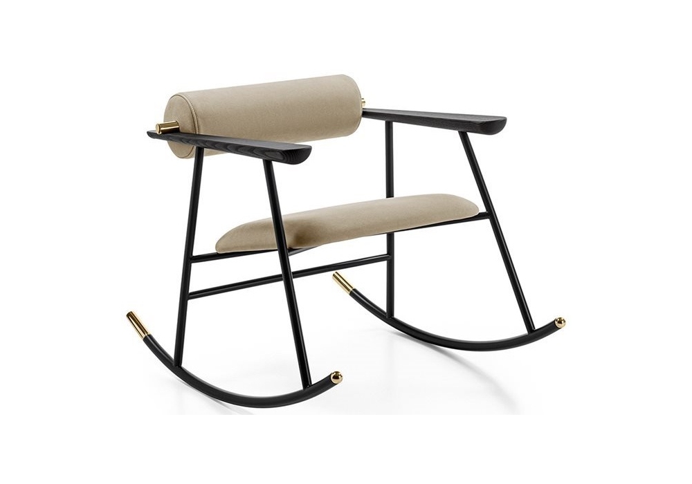 Loulou Rock diseñada por David / Nicolas para Gallotti&Radice es una mecedora que presenta una estructura de metal pintado en negro y detalles de acero niquelado pulido. También disponible con detalles de acero latonado pulido. Reposabrazos de nogal macizo de poro abierto teñido en negro o nogal macizo de poro abierto teñido en miel. Asiento con estructura interna de madera y derivados. Asiento y respaldo acolchados de espuma de poliuretano indeformable de diferentes densidades. Revestimiento en tejido o piel según muestrario. No desenfundable.