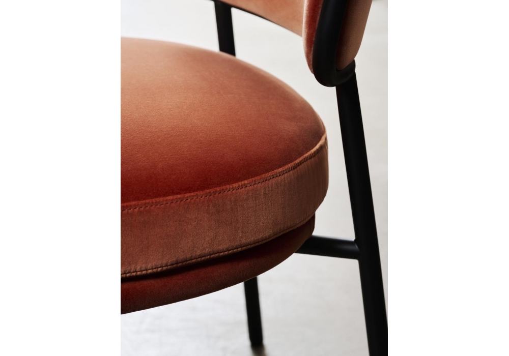 Aristo diseñada por Sebastian Herkner para ClassiCon es una silla con estructura de acero tubular cromado o con recubrimiento en polvo negro. Acolchado de poliuretano con fibra de poliéster y núcleo de muelles ensacados. Tapizado en tela o piel.