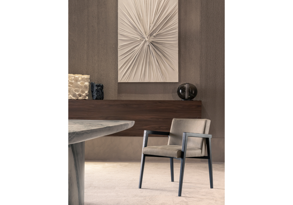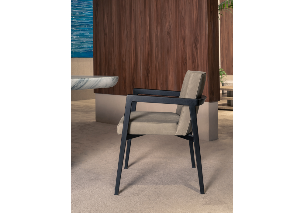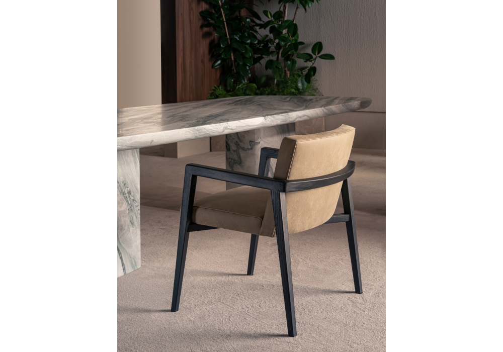 Lanza diseñada por Derek Castiglioni para Casamilano es una silla con estructura en fresno macizo teñido negro mate con acabado poro abierto y tapizado en diferentes tejidos o pieles.