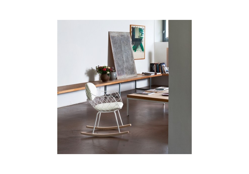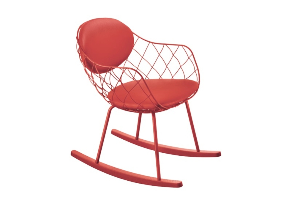 Piña diseñada por Jaime Hayón para Magis es una mecedora con estructura en tubo de acero pintado poliéster. Cuerpo en varilla de acero pintado con polvo de poliéster. Se desliza en fresno macizo natural o pintado. Cojín de asiento/respaldo en espuma de poliuretano desenfundable, revestido en tejido o piel.