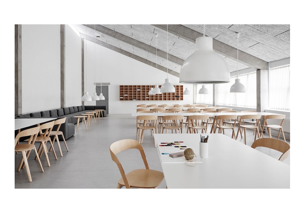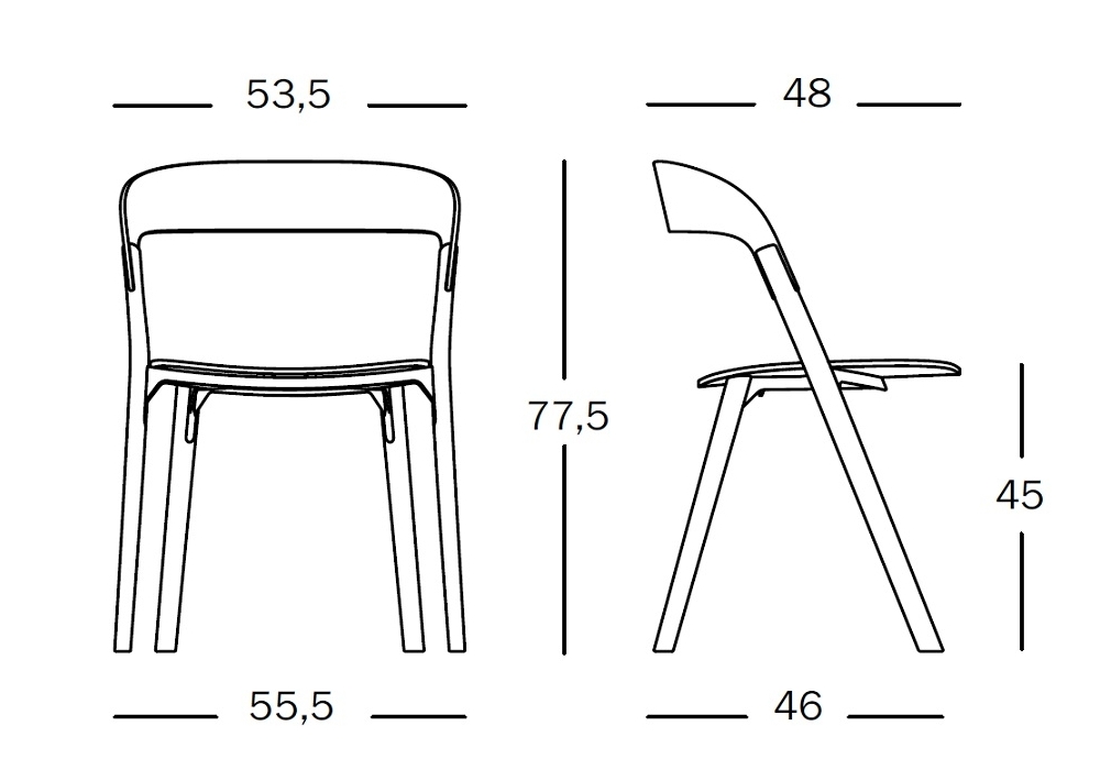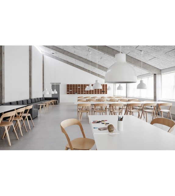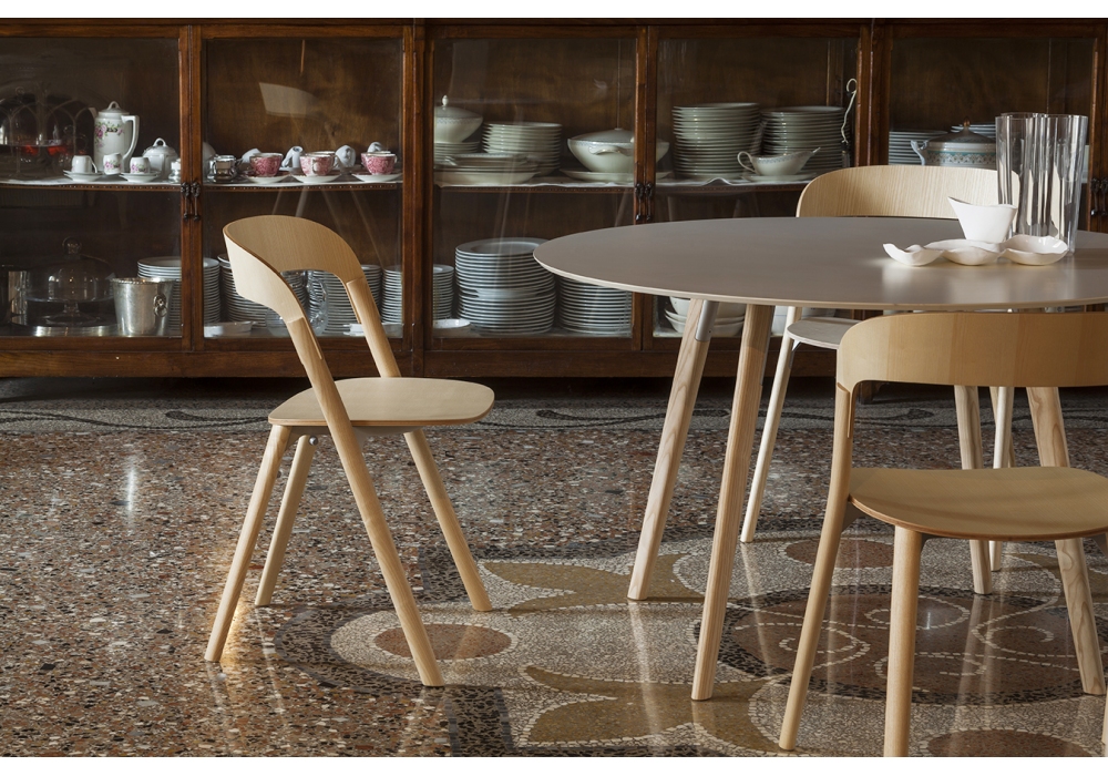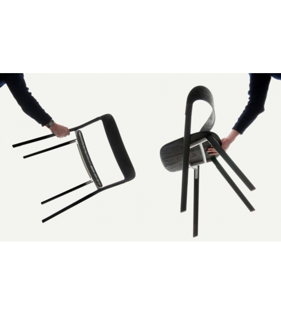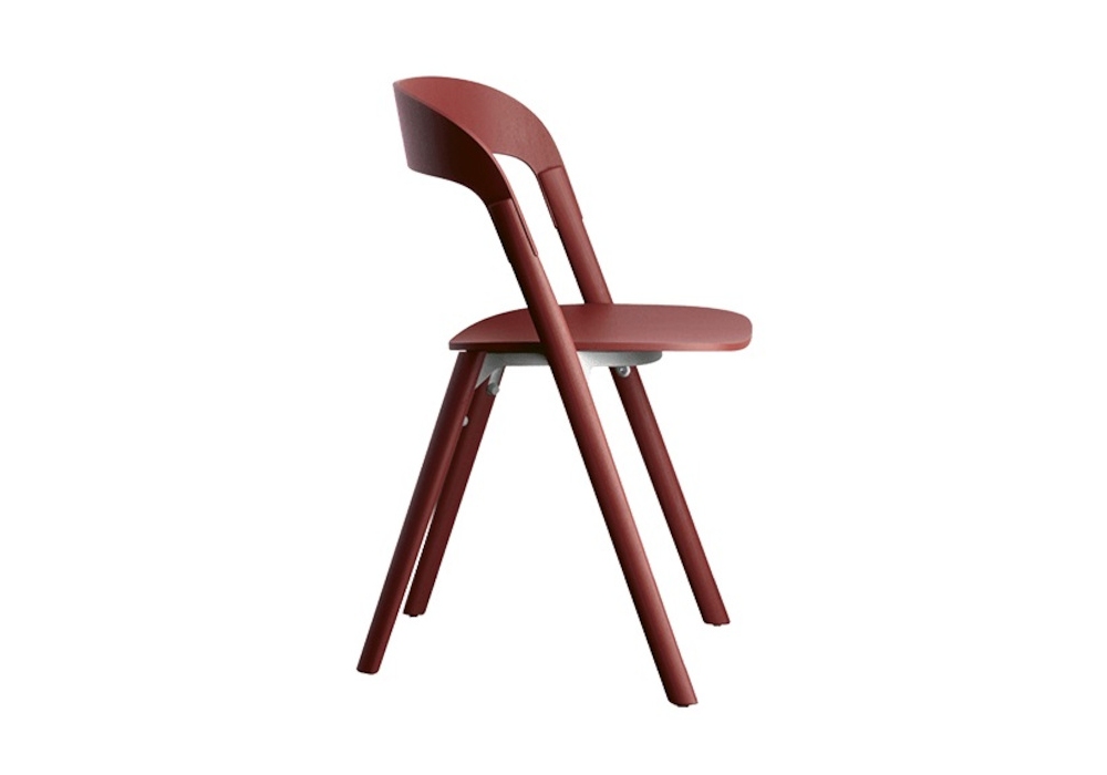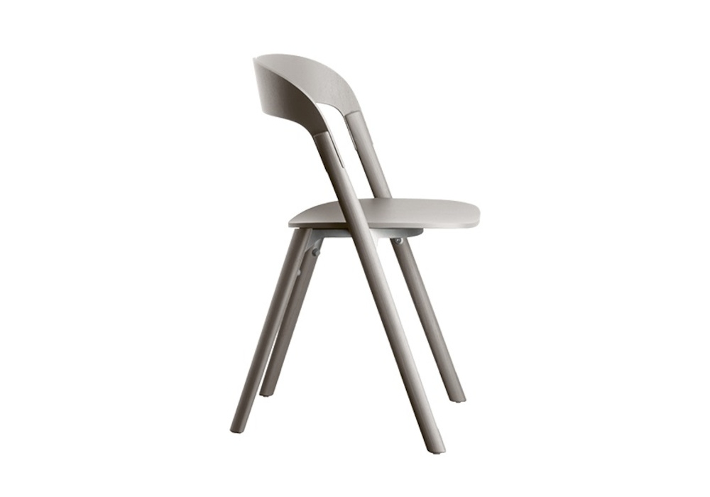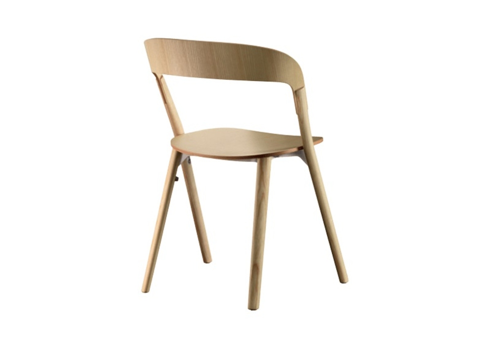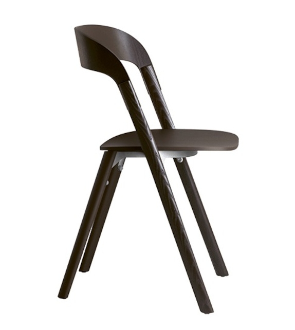 Pila diseñada por Ronan & Erwan Bouroullec para Magis es una silla con respaldo y asiento en madera contrachapada de fresno natural o pintada. Patas de fresno macizo. Los elementos de unión son de aluminio fundido a presión tratado con chorro de arena o pintado con resina epoxi. Tacos de fieltro incluidos.