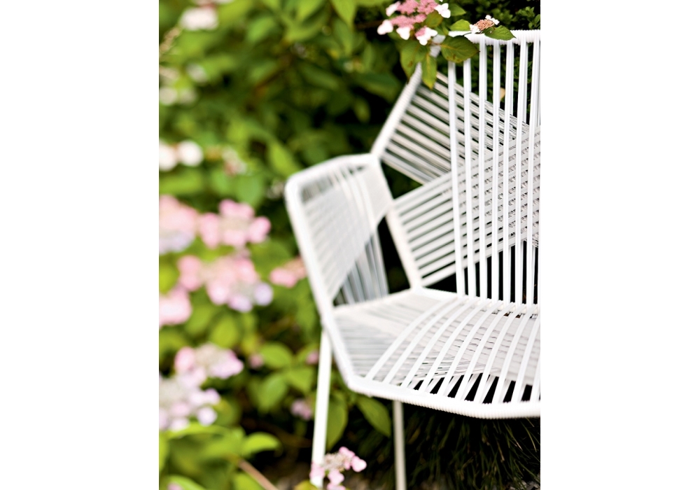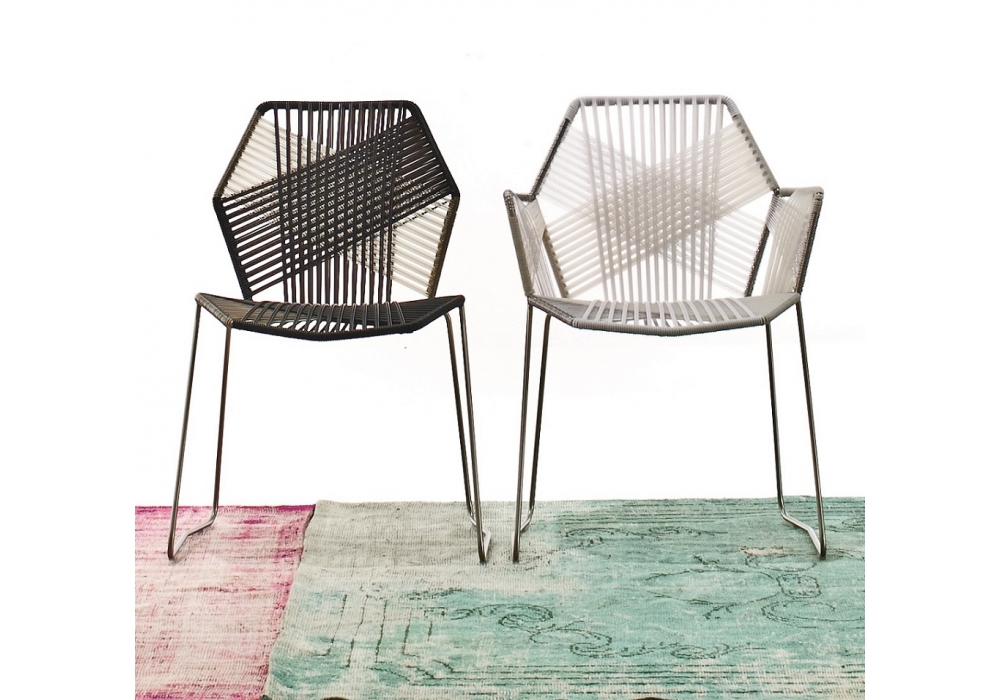 Tropicalia diseñada por Patricia Urquiola para Moroso es una silla con brazos con estructura de acero inoxidable o acero pintado en diferentes acabados y plantilla de PVC. Asiento en alambre de tecnopolímero.