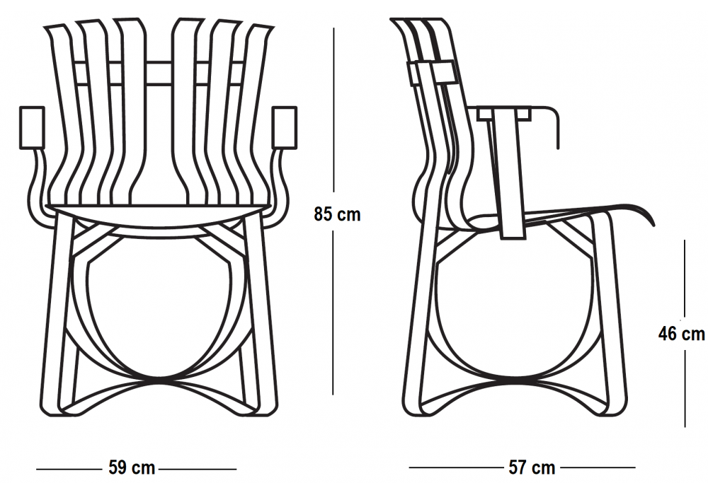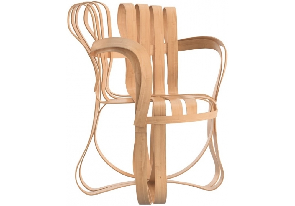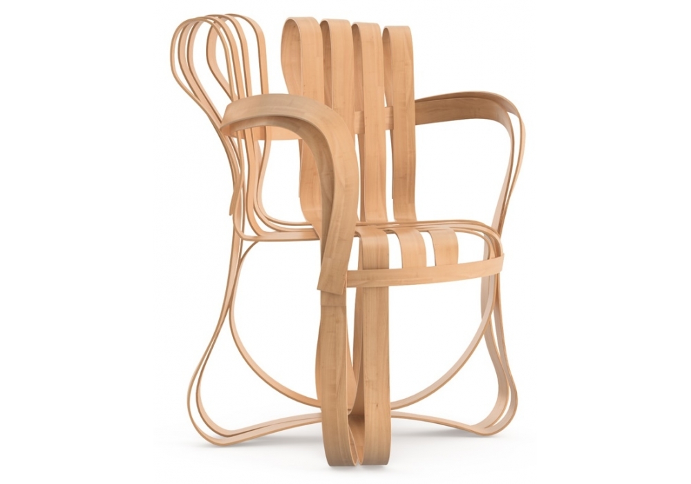 Hat Trick™ diseñada por Frank Gehry para Knoll es una silla con reposabrazos fabricada en madera de arce natural con patas de plástico transparente con acabado mate. El respaldo está formado por bandas preformadas para reforzar el apoyo lumbar. Los reposabrazos se pueden desmontar fácilmente.