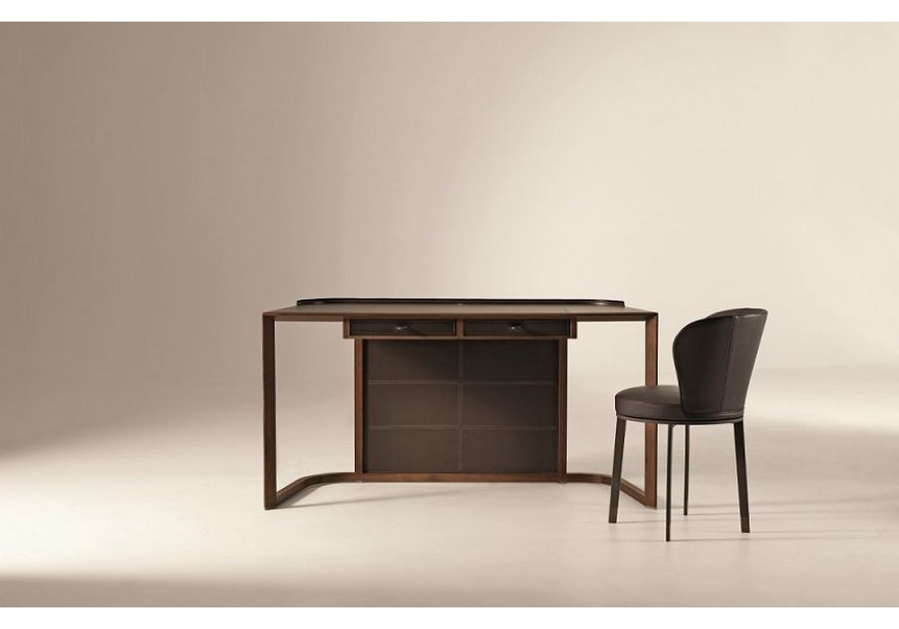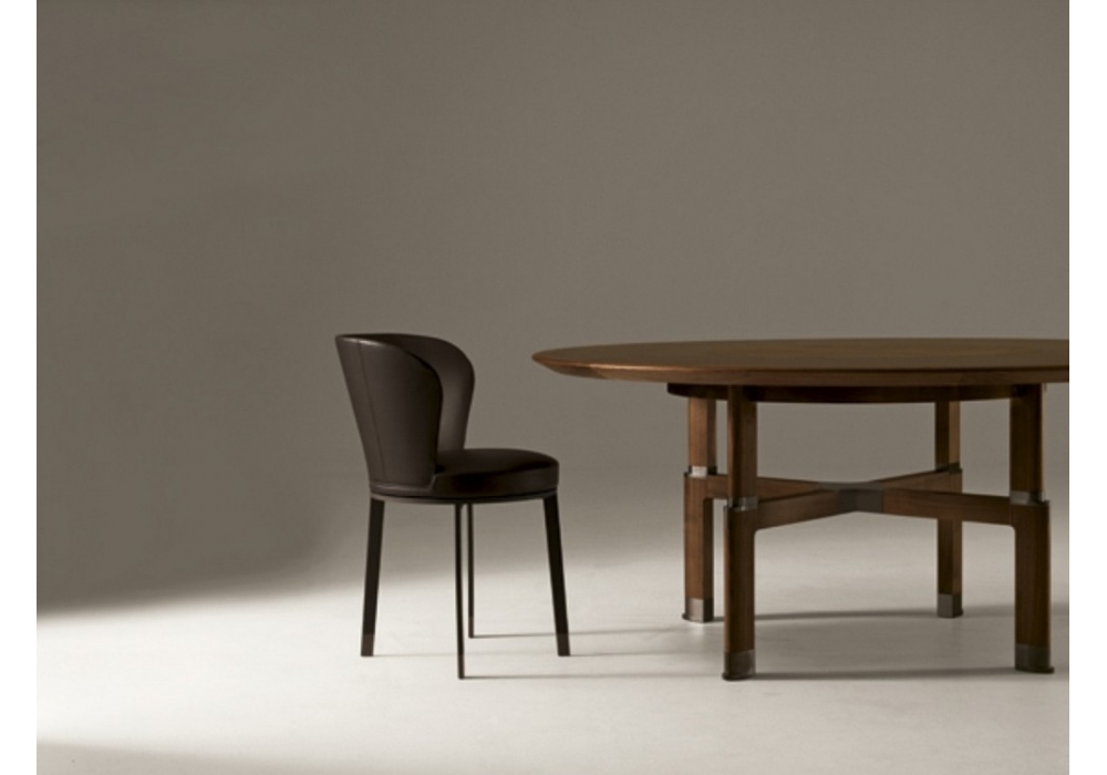 Ode is a bicolor swivel chair designed by Chi Wing Lo for Giorgetti. Swivel chair with the base frame in metal lacquered with liquid rubber in three colours: white, grey or dark brown. The backrest is in compact rigid polyurethane and coldfoamed flexible polyurethane. The upholstery, which is not removable, is available in two colours with the external side in leather and the internal one in fabric or leather. The foot-caps of the legs are in bronzed metal.