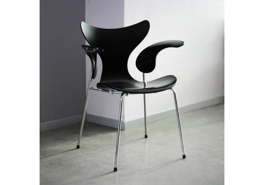 Lily diseñada por Arne Jacobsen para Fritz Hansen es una silla con apoyabrazos realizada con tapizado en tela o piel y 4 patas en tubo de acero cromado.