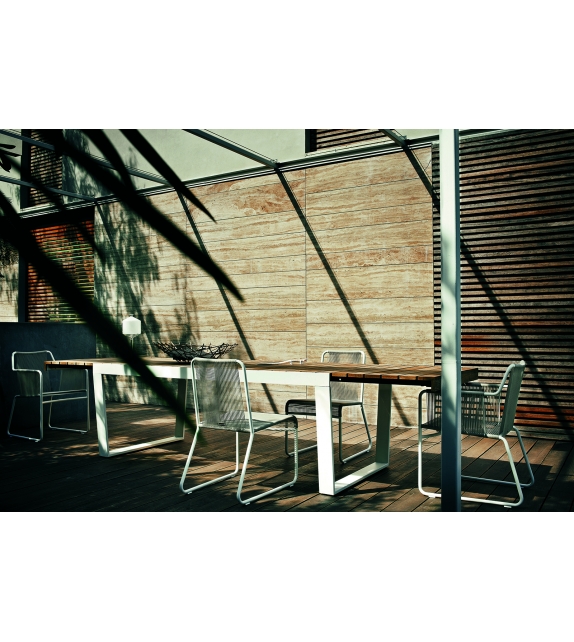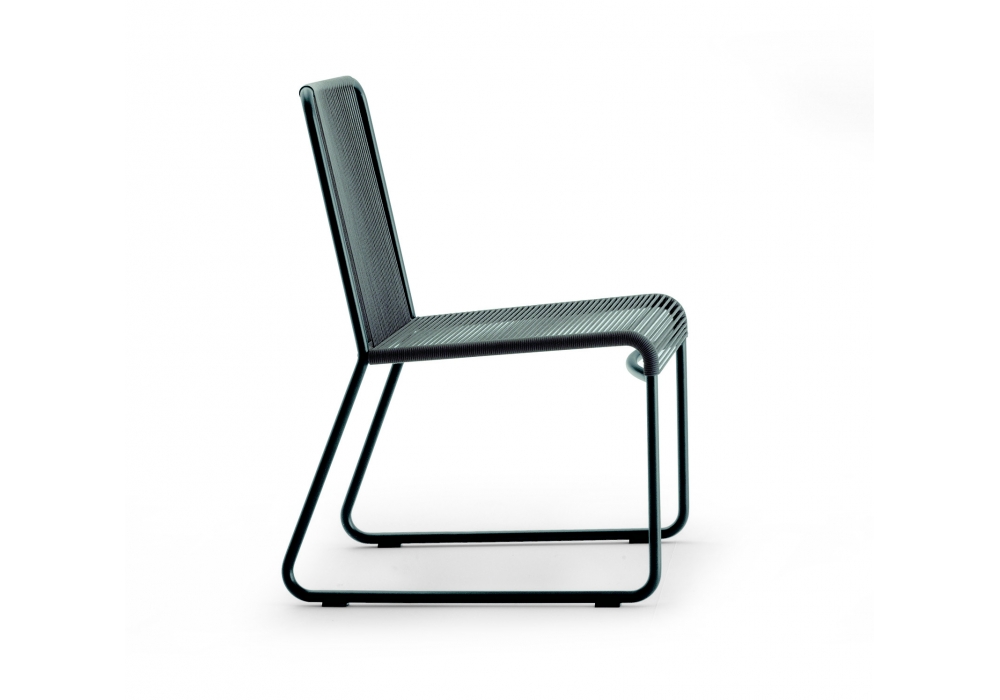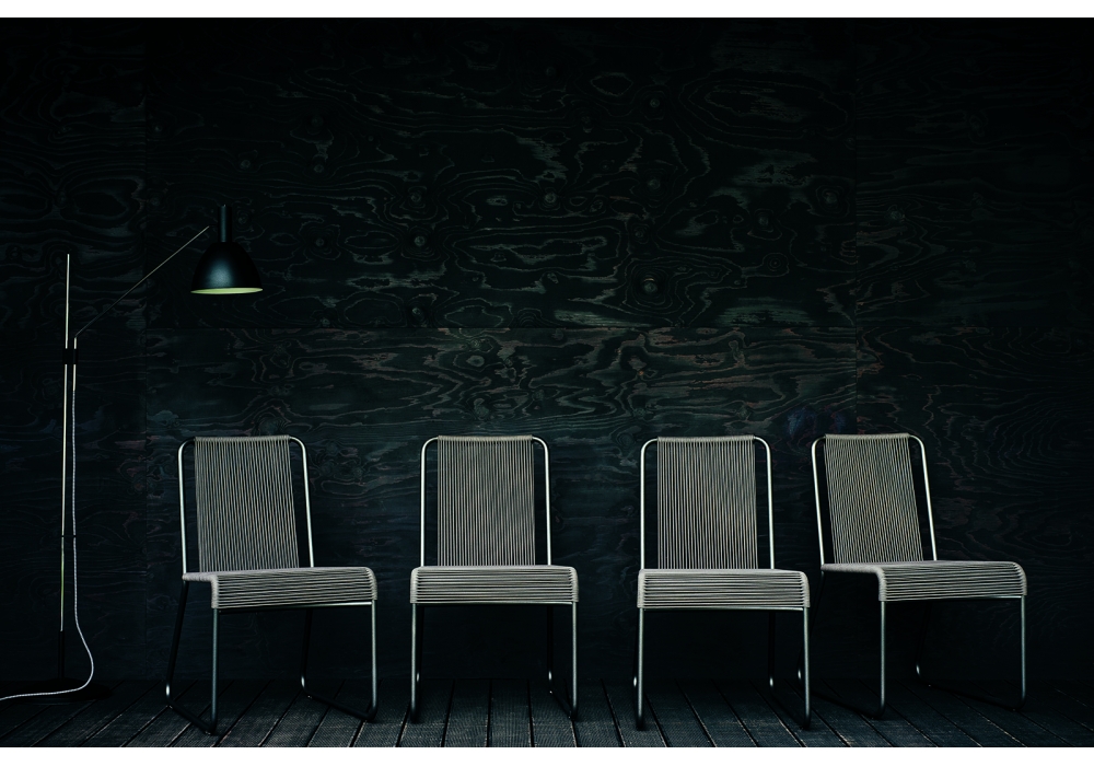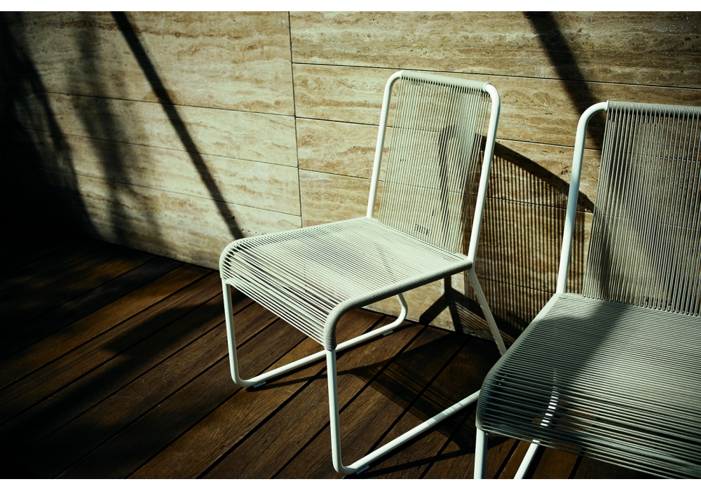 Harp 349 is an outdoor chair designed by Rodolfo Dordoni for Roda. The classic string chair finds a new outdoor dimension, where polyester trails its infinite filaments around a tubular stainless steel structure in one continuous outline. Harp is a celebration of a craft manufacturing: a never-ending weave of cords that twine the stainless steel frame drawing lines that look continuous to the human eye. The structure, made in painted stainless steel welded by hand, and the cords, in a double polyester twisted thread with a cotton finishing.