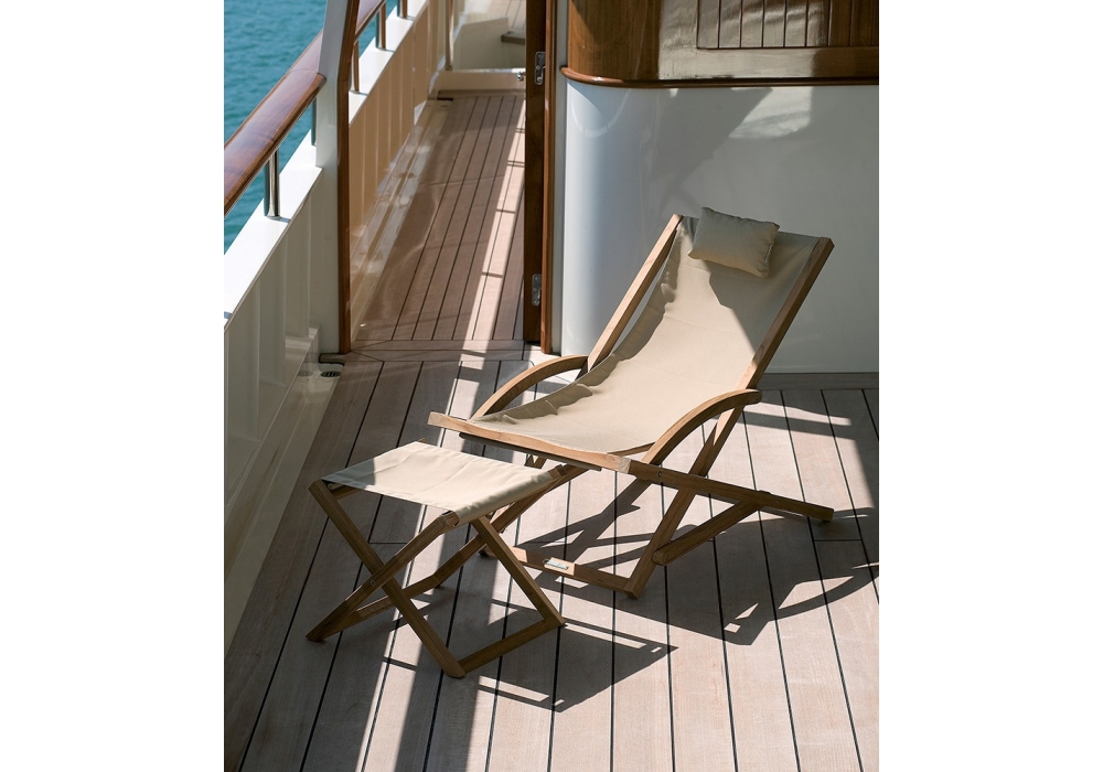 Beacher diseñada por Kris Van Puyvelde para Royal Botania es una silla plegable con estructura en teca y asiento en tejido, disponible en diferentes acabados.