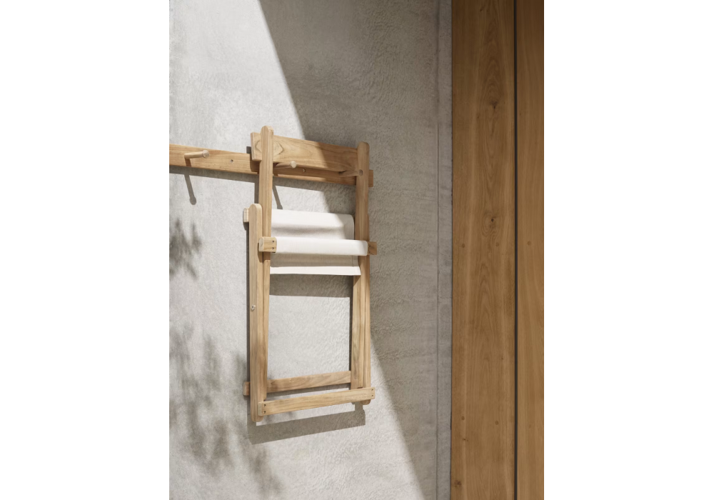 BM4570 diseñada por Børge Mogensen para Carl Hansen & Søn es una silla plegable para exteriores con estructura de teca maciza sin tratar y asiento en tela Heritage Papyrus 18006. Las juntas son siempre de acero inoxidable.