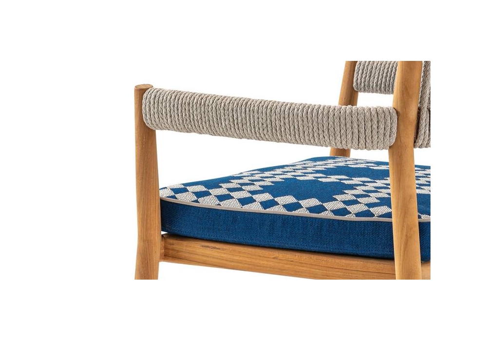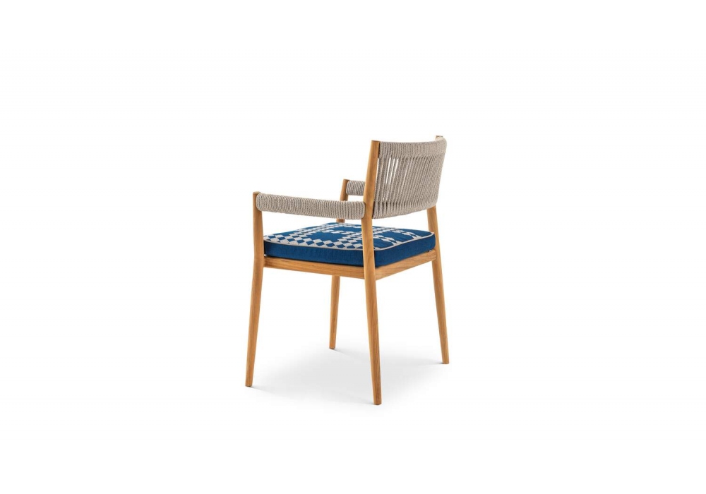Dine Out diseñada por Rodolfo Dordoni para Cassina es una silla con estructura en madera de teca, respaldo y apoyabrazos entrelazados en cuerda Orbettino. Cojín de asiento disponible en diferentes tejidos.