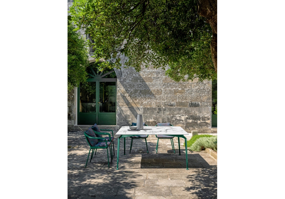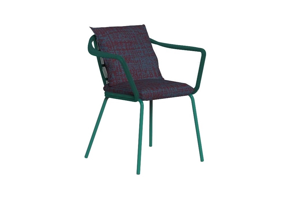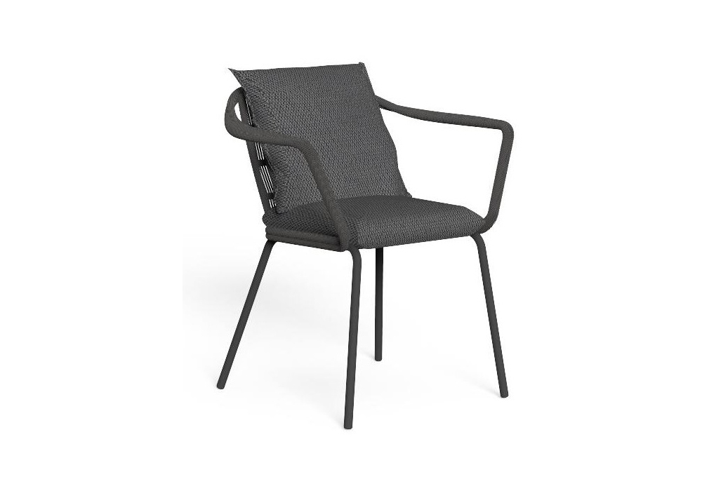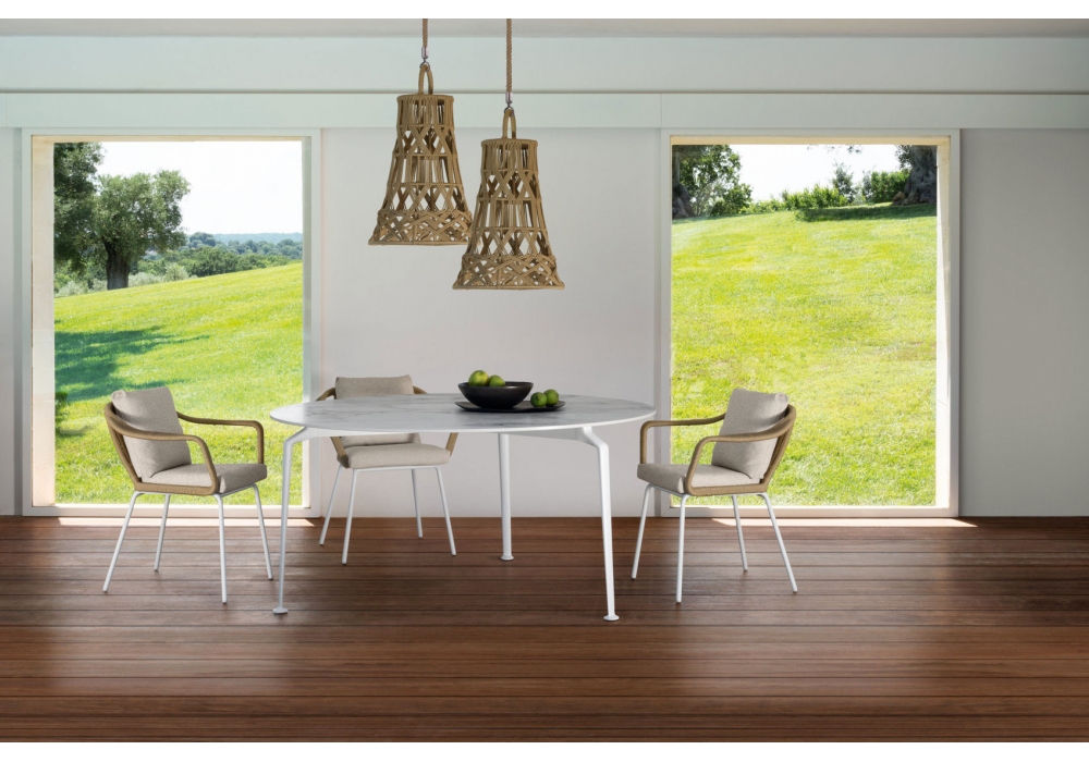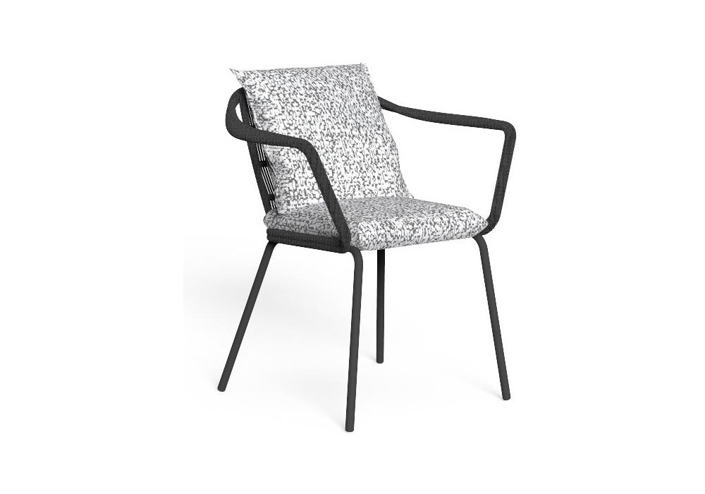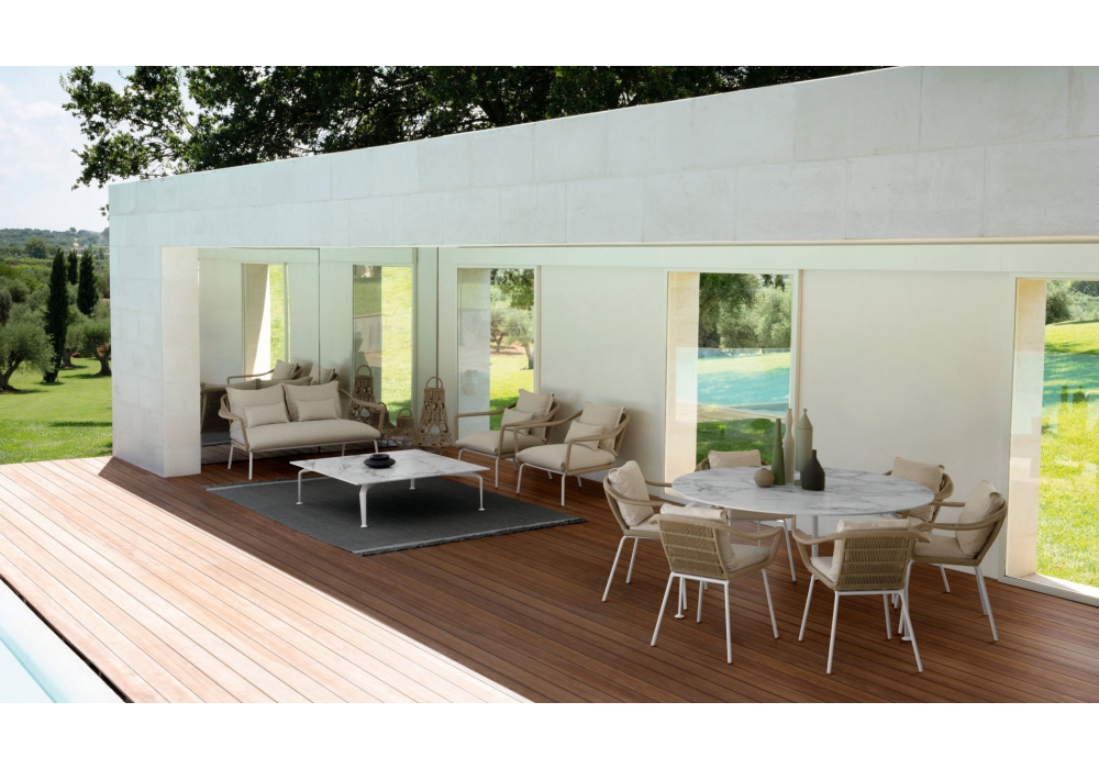 Cruise Alu diseñada por Ludovica y Roberto Palomba para Talenti es una silla de comedor con estructura en cuerda sintética que envuelve el respaldo y los reposabrazos, cojines extraíbles con acolchado de espuma de secado rápido y cubierta con telas para exteriores.