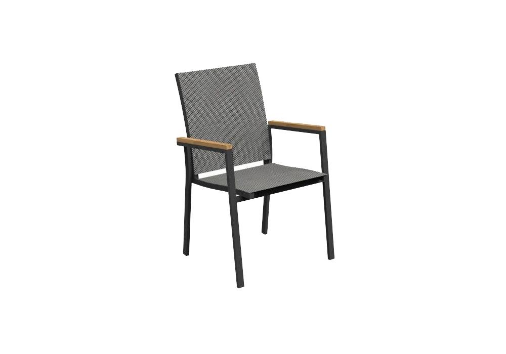 Timber diseñado para Talenti es una silla con estructura de aluminio en tres acabados, asiento y respaldo en textil a juego y reposabrazos en teca. Apilable