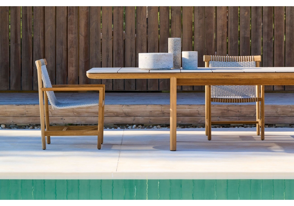 Amanu diseñada por Yabu Pushelberg para Tribù es una silla con brazos con estructura de teca y asientos tejidos en Canax, un material a base de cáñamo muy ligero y resistente. Es posible elegir la versión equipada con un cojín para el asiento o para el asiento y el respaldo, en diferentes tapizados.