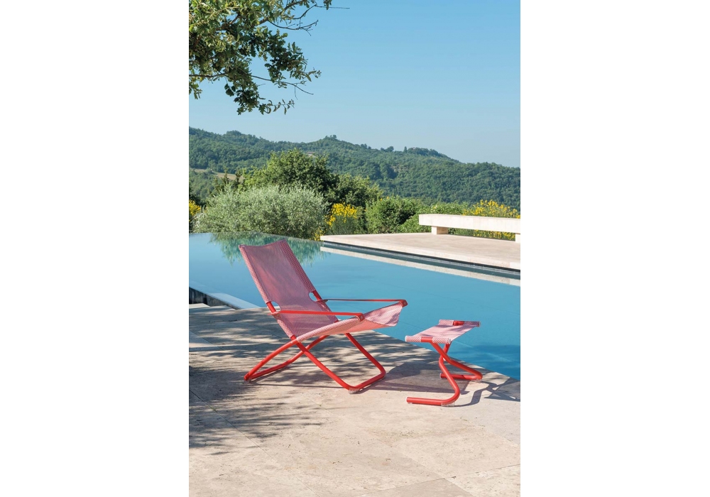 Snooze diseñada por Chiaramonte / Marin para EMU es una reposera de jardín de grandes dimensiones y forma sinuosa y envolvente. A través de un simple mecanismo de ajuste del reposabrazos, el asiento puede adoptar dos posiciones, para leer y para descansar. Disponible en diferentes acabados.