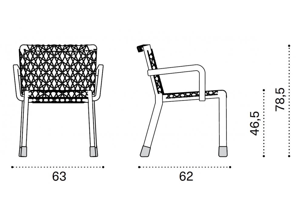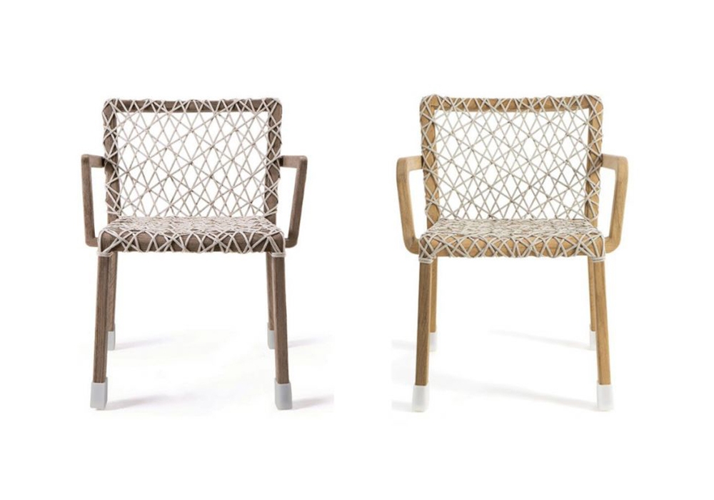 Rafael diseñada por Paola Navone para Ethimo es una silla para exteriores con reposabrazos con estructura disponible en teca natural o decapada y asiento en cuerda.