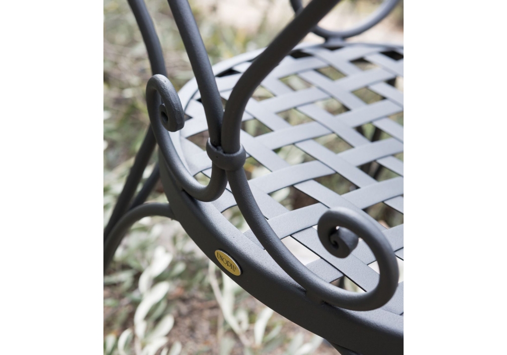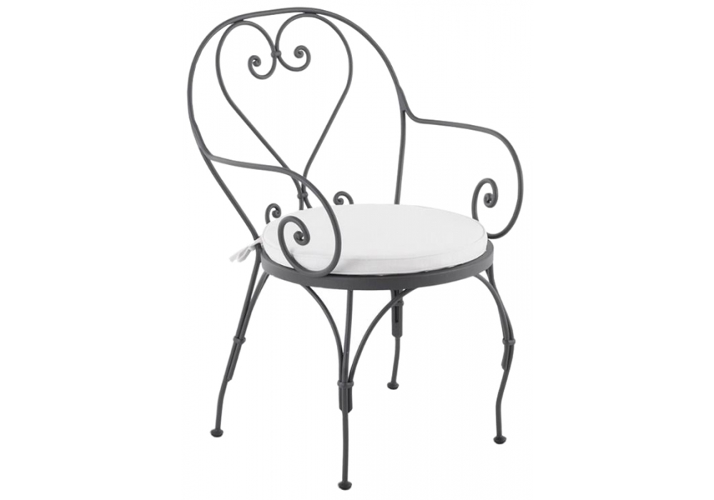 Aurora producida y firmada por Unopiù es una butaca con estructura de hierro forjado a mano y pintada en color grafito. Los cojines de los asientos están hechos de tela acrílica color leche.