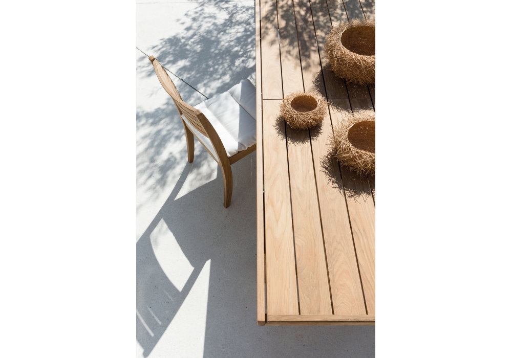 Chelsea producida y diseñada por Unopiù es una silla apilable con estructura en madera de teca natural y cojines en tejido acrílico color leche.