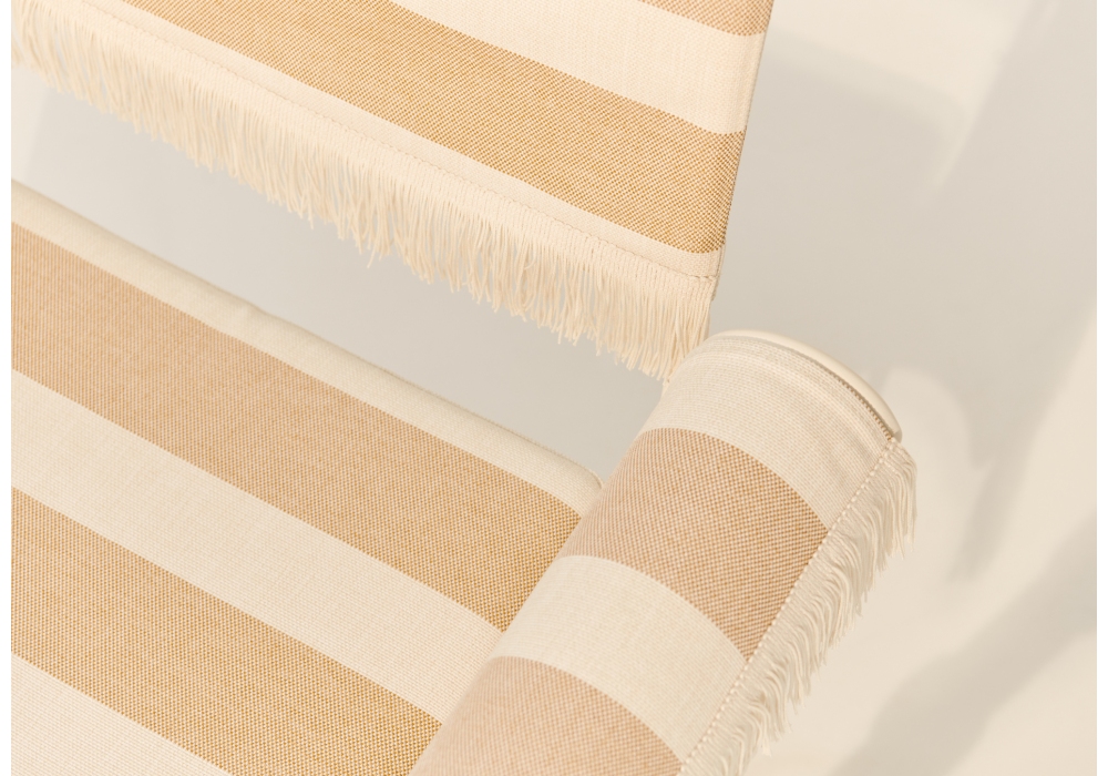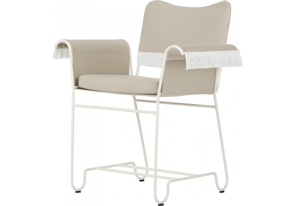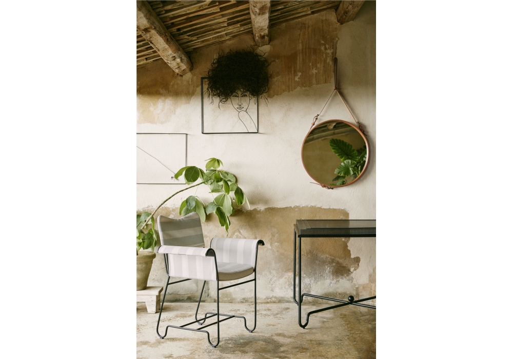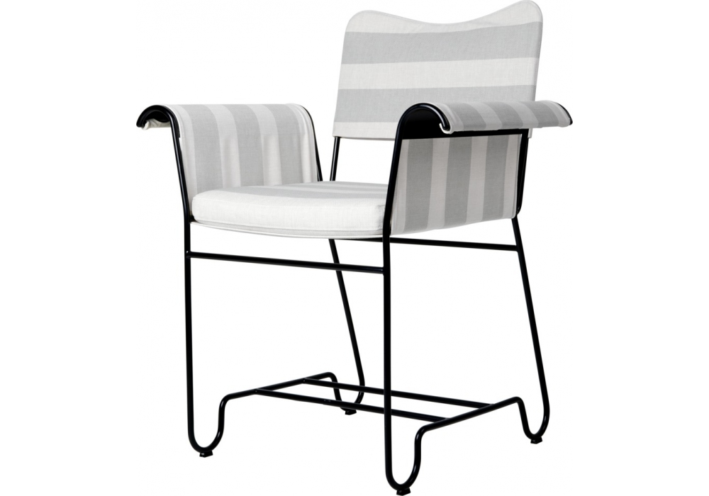 Tropique diseñada por Mathieu Matégot para Gubi es una silla para exterior con estructura en varillas de acero inoxidable y cojín del asiento, respaldo y apoyabrazos revestidos en tejido para exterior.