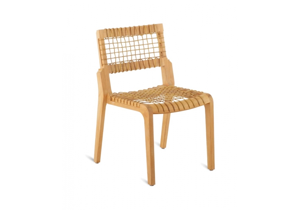 Synthesis producida y diseñada por Unopiù es una silla apilable con estructura en madera de teca natural y cuerda tejida waprolace. Los cojines son de tela acrílica disponible en diferentes colores.