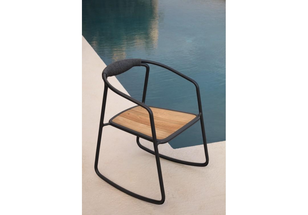 Duo diseñada por Koen Van Extergem para Manutti es una mecedora de exterior compuesta por dos estructuras de aluminio plegadas que parecen estar unidas por cuerdas. Tapizado de los cojines en tela. Disponible en diferentes acabados.