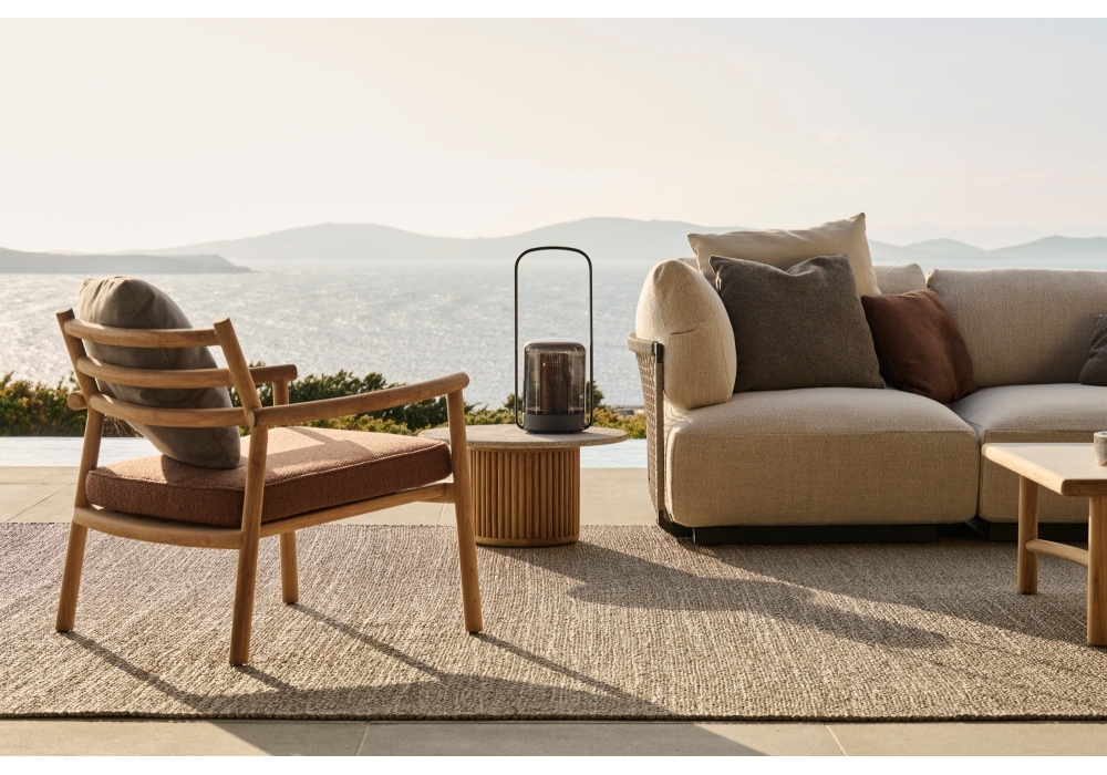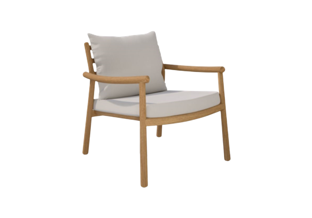 Ukiyo diseñada por Monica Armani para Tribù es una butaca con estructura en teca y asiento tapizado, tapizado en diferentes acabados.